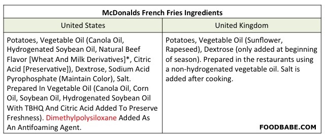 Here’s a followup to my earlier post about McDonald’s fries. In 2013 Food Babe posted the ingredients for McDonald’s fries in the US and in the UK.