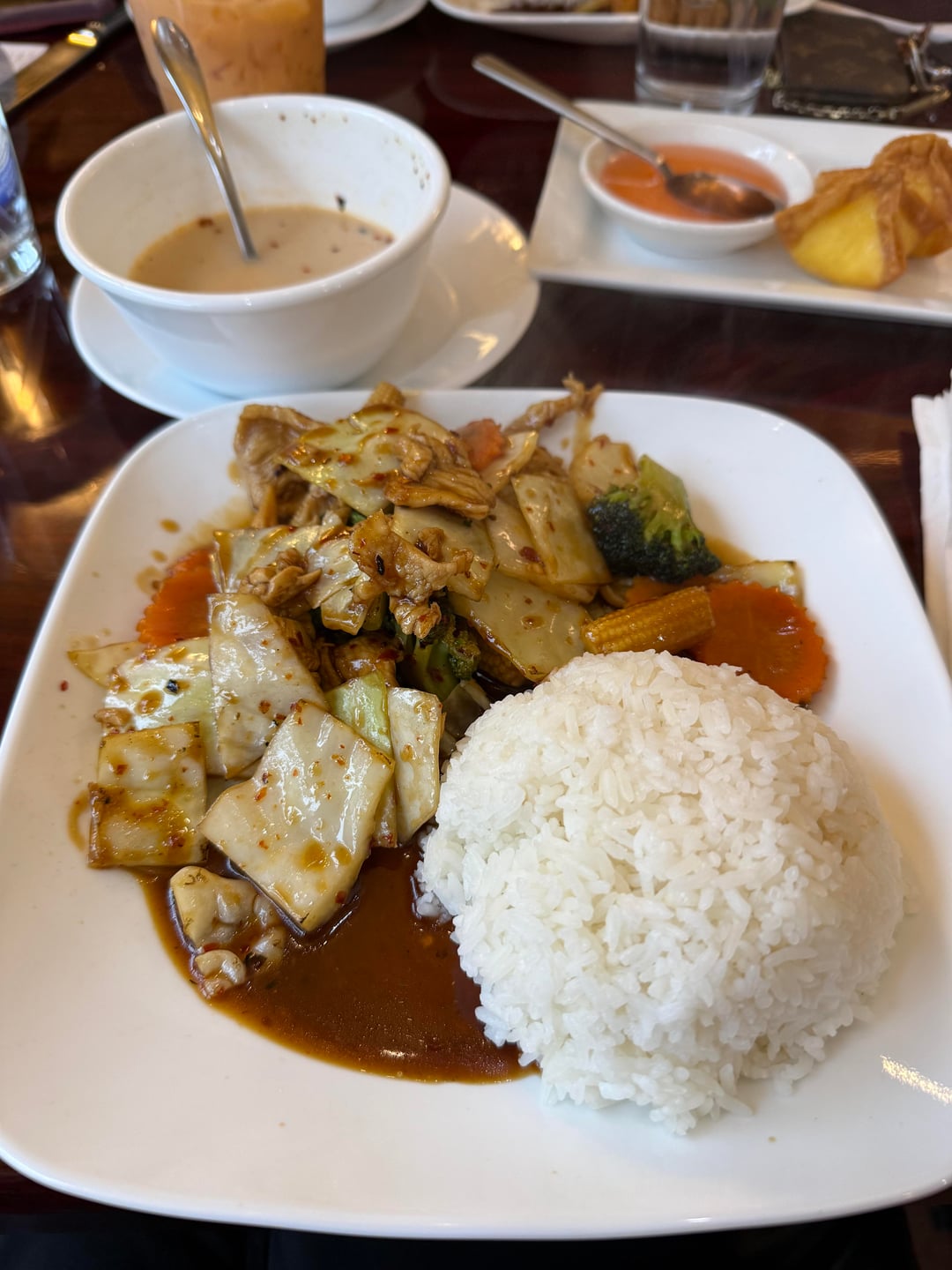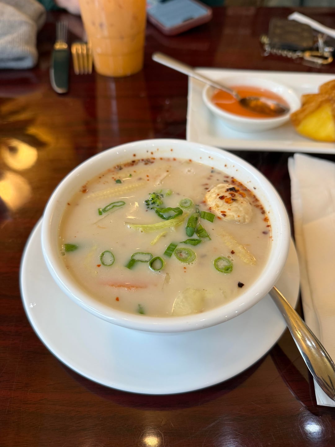 tom kha soup with vegetables and garlic thai entree with chicken and rice!by delanflem Dining and Cooking