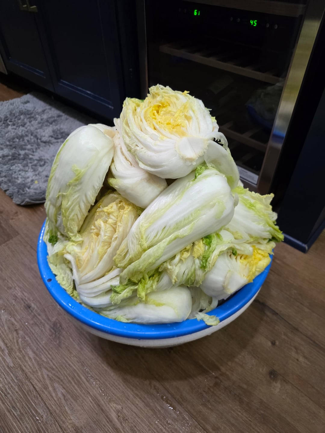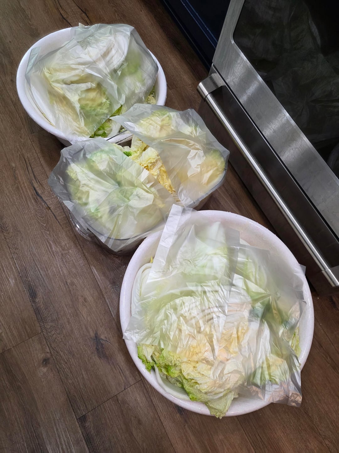Salted 12 heads of napa cabbage with 3 kg of salt mixed with water for about 10 hours.