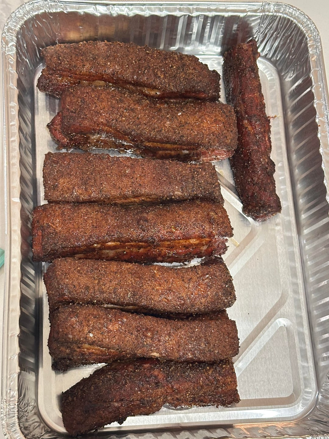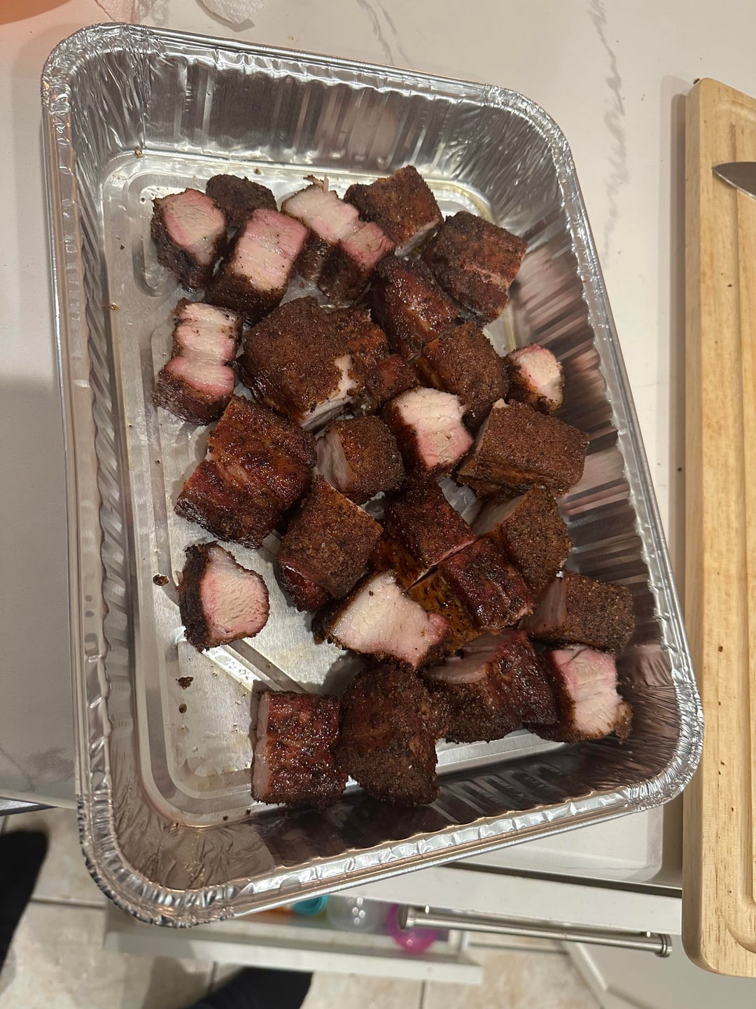 My lawd.Rubbed in Kimber’s all-purpose and smoked low at 225° for 2 hours. After I brought it to 300° until 200-205°.Pulled it out to rest for a bit, then put BBQ sauce and maple syrup on. Total time around 4hrs.by DillDeer 4 Comments DillDeer 3 days ago Kinder* not Kimber. 1911s on my mind. sportyfunguy 3 days ago What do I ask for the cut of pork? EmpatheticRock 3 days ago Burnt end are brisket/beef. spinpuzzle 3 days ago Here comes the “burnt end” extremists.They look delicious! Bravo!