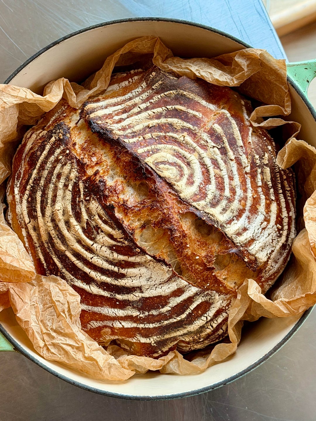 I didn't flour the basket enough (it got stuck) and I forgot to lower the temp of the oven when I took the lid off the dutch oven.