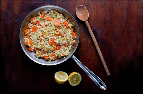 - Heat the olive oil over a medium-sized, heavy skillet or saucepan, and add the leeks and carrots. Cook, stirring, until the leeks are tender and translucent and the carrots have softened slightly, about five minutes. Add the garlic and salt to taste. Cook, stirring, until the garlic smells fragrant, about a minute. Add the rice and about 1/2 teaspoon salt, and stir to coat the grains with olive oil. Add the water, and bring to a boil. Reduce the heat, cover and simmer over low heat until the rice is tender, about 45 minutes. Remove from the heat, and do not remove the cover for 10 minutes. Then stir in the lemon juice, and taste and adjust salt. Serve hot or warm.
