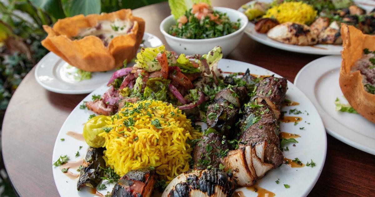 Lebanese specialties like kebabs and shawarma are served with rice and salad.