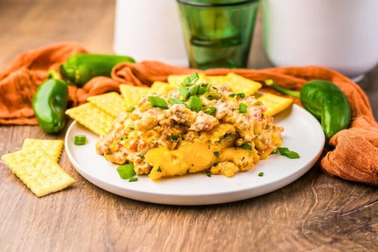 [**Slow Cooker Cowboy Crack Dip**](https://www.kimschob.com/cowboy-crack-dip/) is ready in just **2-3 hours** and totally lives up to its name. Packed with savory sausage, creamy cheese, corn, and a kick of jalapeño heat, every scoop is smoky, cheesy, and absolutely irresistible.