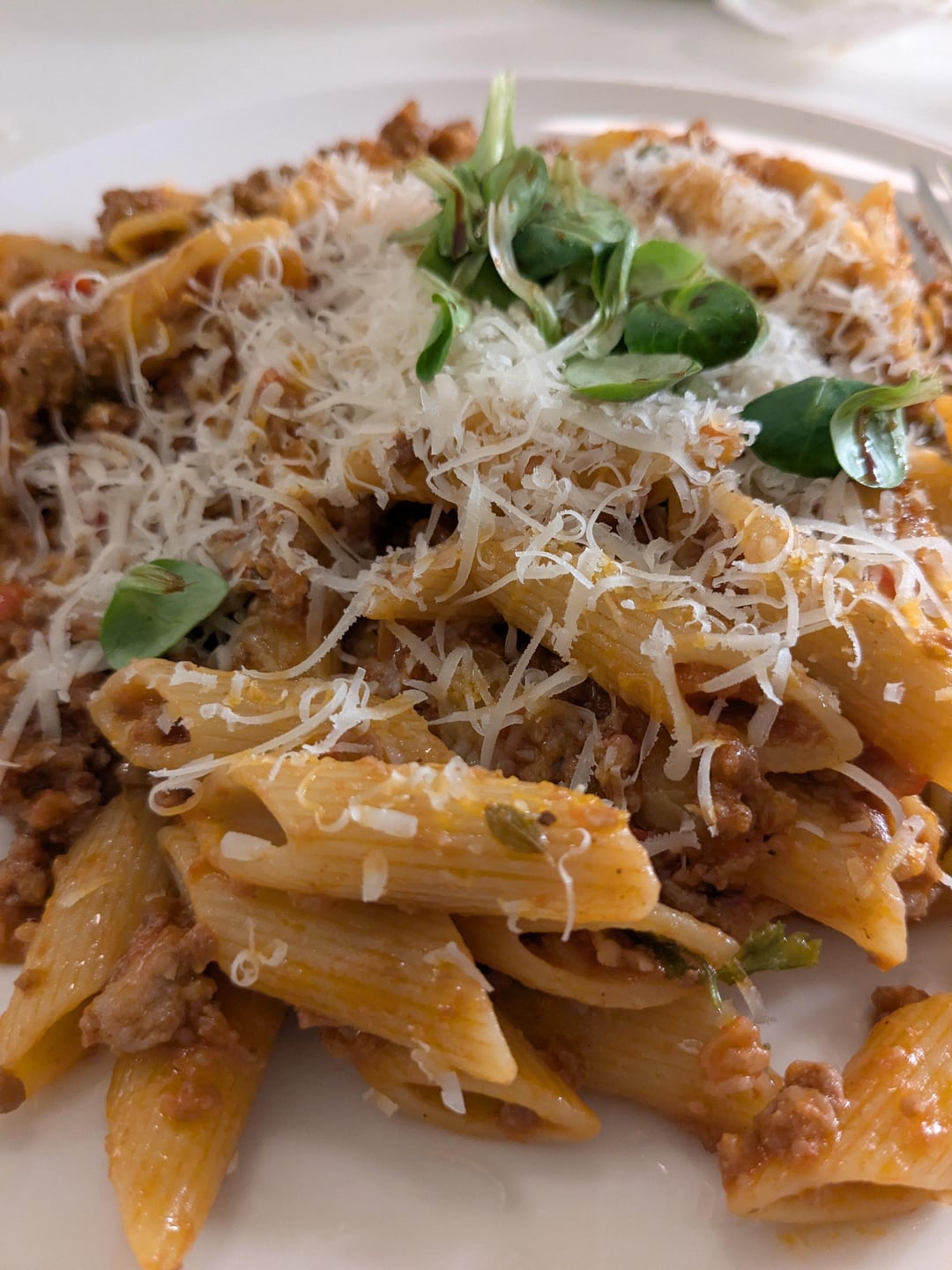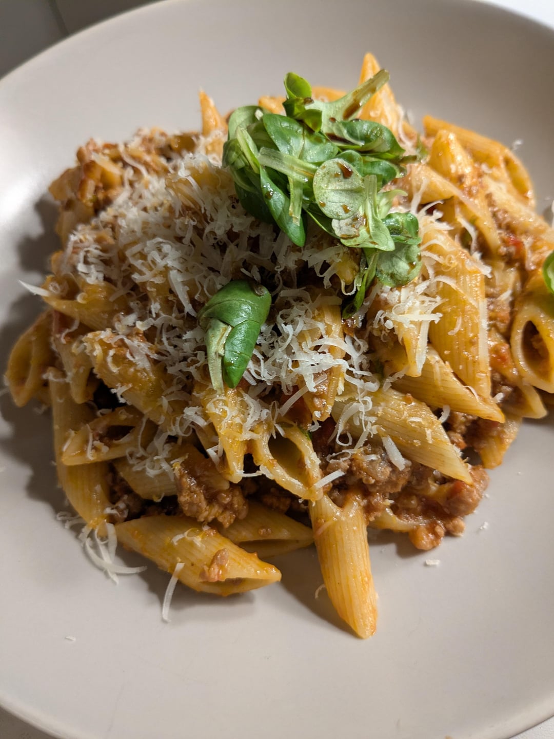 slow cooked homegrown pork (courtesy of my sis and brother in law) with shallots, carrot, garlic, splash of white vine, san marzano tomatoes, tomato paste, some homemade tomato sauce, touch of sweet chilli sauce and splash of milk at the end. Salt, mix of peppers and kala namak salt. Parmegiano I got from Italy bc my friends knowhow much I adore good cheese and some Solunac, goat cheese from Serbia.