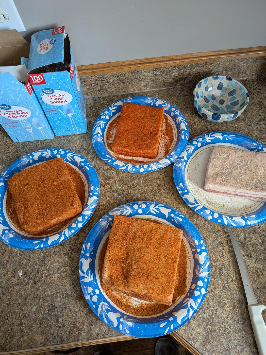All but one have a base layer of HR garlic jalapeno, one with HR sweet bbq, one with comp bbq, one with honey chipotle. The last one I just went with a solid layer of boars night out white lightning alone and they are going down over b&b oak & hickory with b&b cherry chips. Set em down at 11:45 ct.