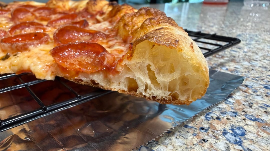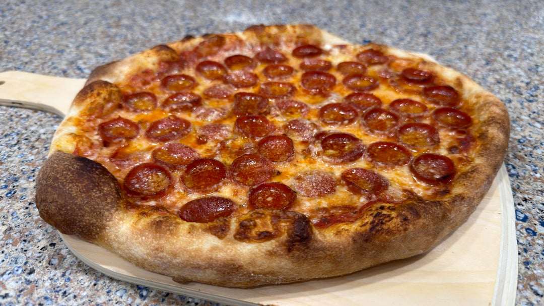 Pep pizza 63% hydration baked @550F for 7-8 minutes in home oven.