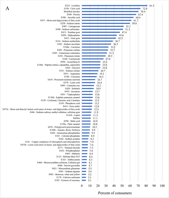 Additionally, 60 food additives were consumed by more than 5% of adults, compared to 71 among children. In this nationally representative study based on three 24 h dietary records/recalls, the percentage of consumers (in adults / children) was for instance: 61.7/79.2% for mono‑ and diglycerides of fatty acids, 52.1/65.7% for carrageenan, 59.8/65.9% for sodium nitrite, 23.2/26.6% for acesulfame K, 19.3/20.5% for aspartame, 13.6/29.8% for sulphite ammonia caramel, 5.5/5.9% for monosodium glutamate, 13.7/17.0% for sucralose, 11.9/13.1% for carboxymethyl cellulose, and 7.5/12.0% for titanium dioxide. Detailed quantitative intakes for each additive are provided in eTable 1 (adults) and eTable 2 (children). Acceptable Daily Intakes (ADI) exceedances were assessed only for food additives consumed by more than 5% of the population. In children, the ADI was exceeded for rosemary extract (E392) in 2.7% of the overall population and in 27.3% among consumers only. Among adults, exceedances were also observed for rosemary extract and sucralose (E955), affecting 0.3% and 0.09% of the total population, and 5.5% and 0.67% of consumers, respectively.