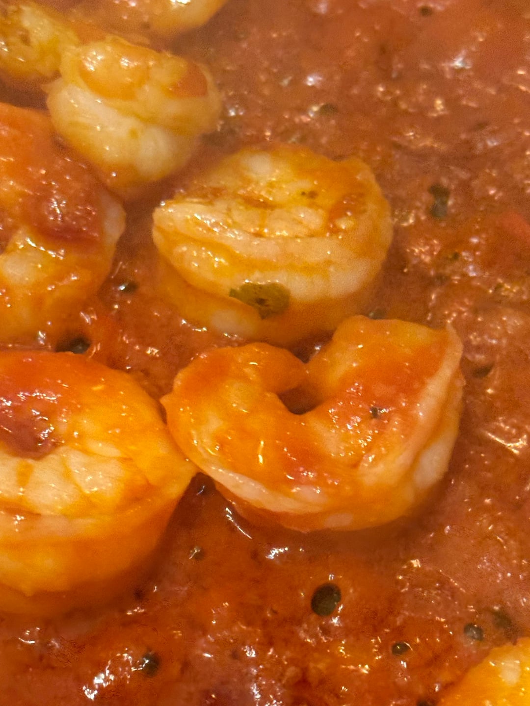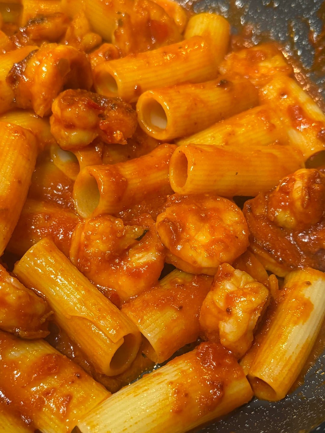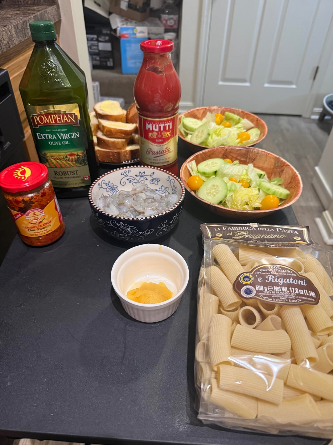 I'm 55, I've been cooking and baking now for 45 years or so, it wasn't until the last year that I started cooking very quick pasta dishes. Usually they require less ingredients and are pretty simple. You know it's gonna be quick when the first thing you do is get the water to a boil. So that's what I did here, brought the salted water to a boil, put my other pan on high heat, dropped the pasta, added some olive oil to the other pan and added the garlic and chilis, very important note on that garlic at the end for those that are already shaking their head at my garlic😝, once the pasta was about half done I added the shrimp to the pan, sautéed that on high for 1 minute, then flipped shrimp, went another minute, added the Passata then added the pasta to the pan, tossed to combine, added a small ladle of pasta water, tossed again and served. Had a half loaf of my homemade Italian Bread in the freezer and made a quick salad. Man oh Man that was tasty, just enough spice to tingle on the lips. Now, about the garlic, many food snobs, like myself sometimes, probably looked at my garlic and said "this joker is using jarred or squeeze garlic!!" It may look that way, but it's not, it is a shortcut though that I like. I buy my garlic about 10 bulbs at a time, I've also bought big bags of the pre peeled stuff, I add the cloves to a food processor or blender with enough olive oil to be able to puree it, I add it to a silicone ice cube tray and freeze. They are 1 tablespoon sized cubes which I count as about 3 cloves. I freeze that then store in an airtight container or bags in the freezer. So that's the deal with that. Apology accepted🤣