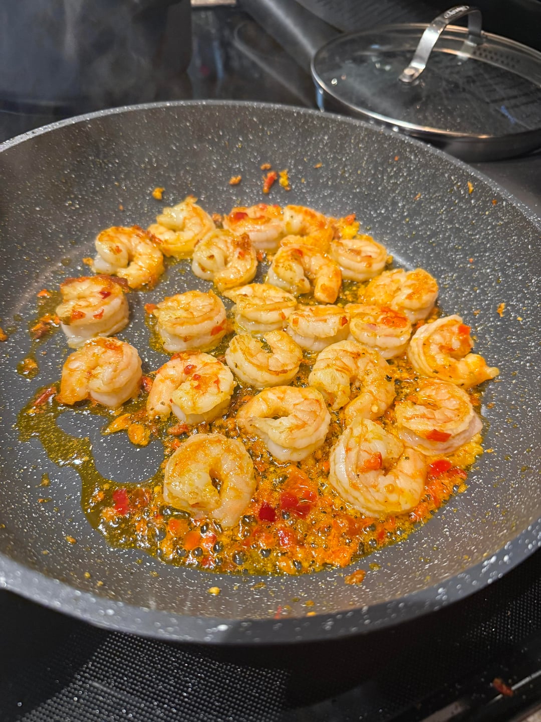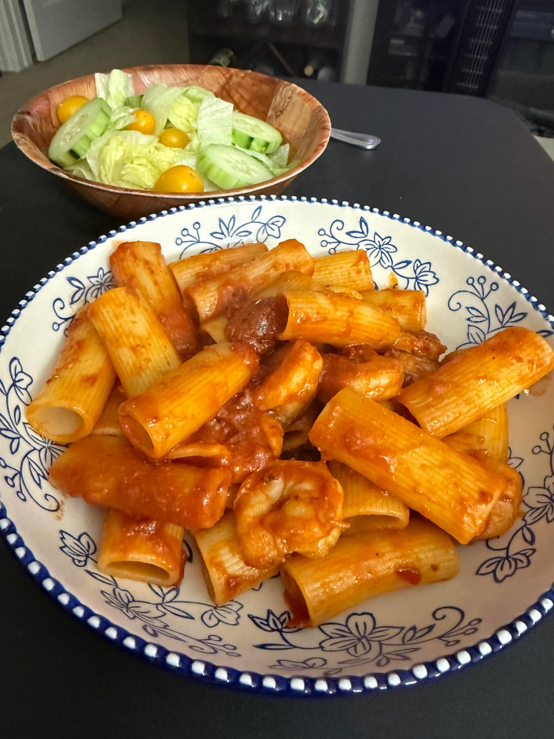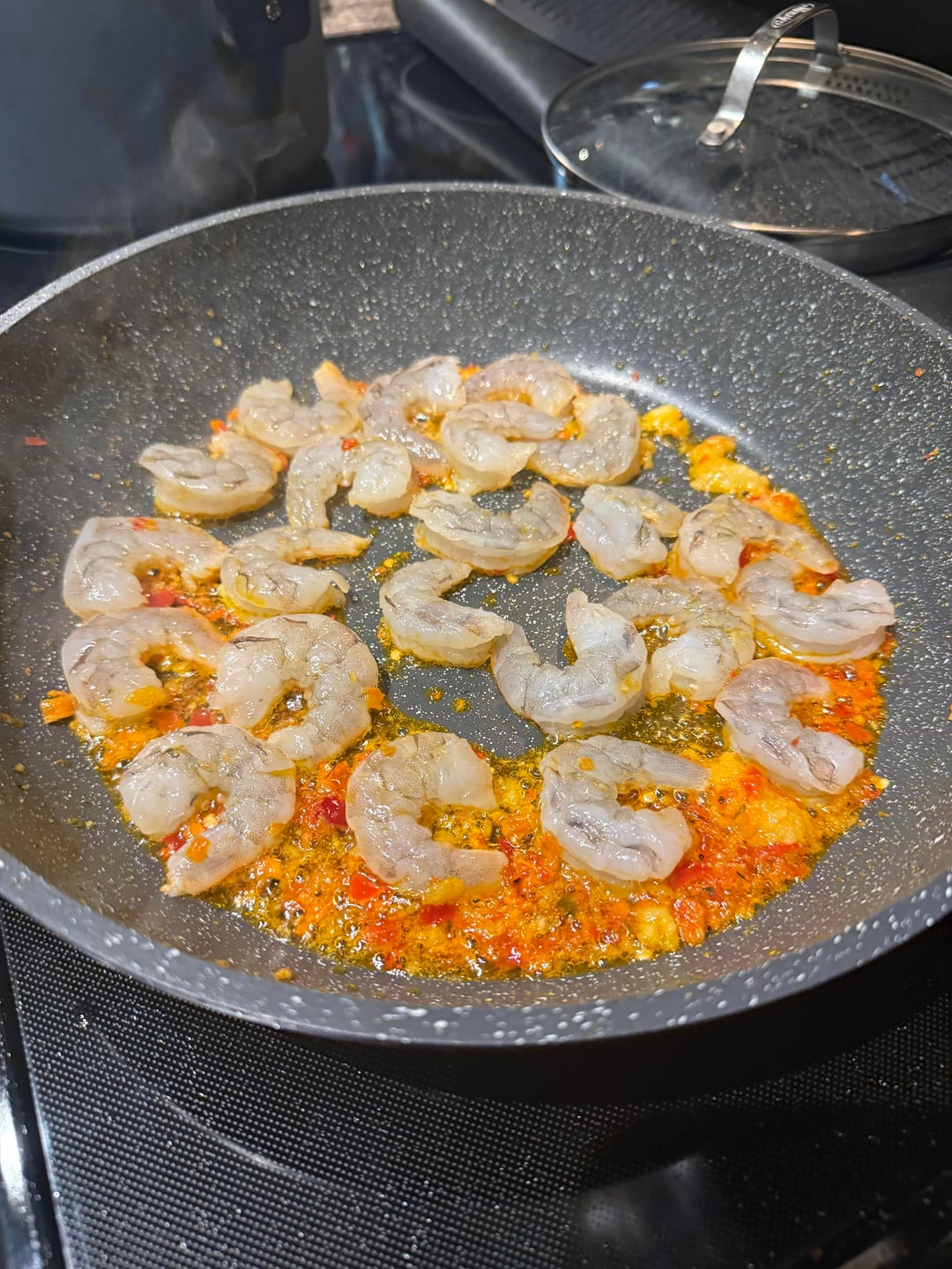 I'm 55, I've been cooking and baking now for 45 years or so, it wasn't until the last year that I started cooking very quick pasta dishes. Usually they require less ingredients and are pretty simple. You know it's gonna be quick when the first thing you do is get the water to a boil. So that's what I did here, brought the salted water to a boil, put my other pan on high heat, dropped the pasta, added some olive oil to the other pan and added the garlic and chilis, very important note on that garlic at the end for those that are already shaking their head at my garlic😝, once the pasta was about half done I added the shrimp to the pan, sautéed that on high for 1 minute, then flipped shrimp, went another minute, added the Passata then added the pasta to the pan, tossed to combine, added a small ladle of pasta water, tossed again and served. Had a half loaf of my homemade Italian Bread in the freezer and made a quick salad. Man oh Man that was tasty, just enough spice to tingle on the lips. Now, about the garlic, many food snobs, like myself sometimes, probably looked at my garlic and said "this joker is using jarred or squeeze garlic!!" It may look that way, but it's not, it is a shortcut though that I like. I buy my garlic about 10 bulbs at a time, I've also bought big bags of the pre peeled stuff, I add the cloves to a food processor or blender with enough olive oil to be able to puree it, I add it to a silicone ice cube tray and freeze. They are 1 tablespoon sized cubes which I count as about 3 cloves. I freeze that then store in an airtight container or bags in the freezer. So that's the deal with that. Apology accepted🤣