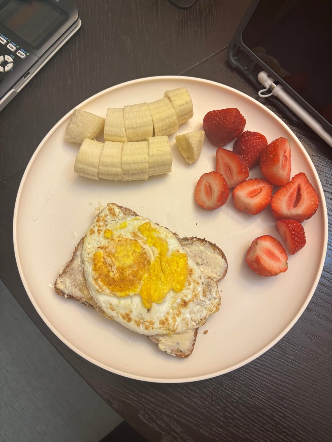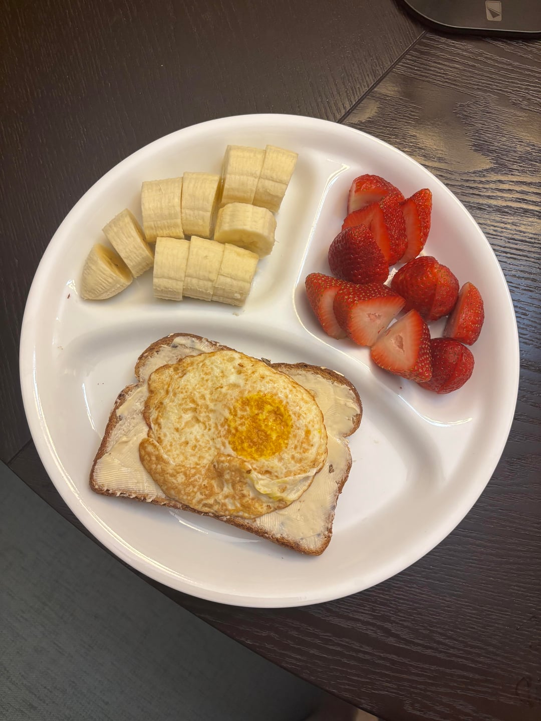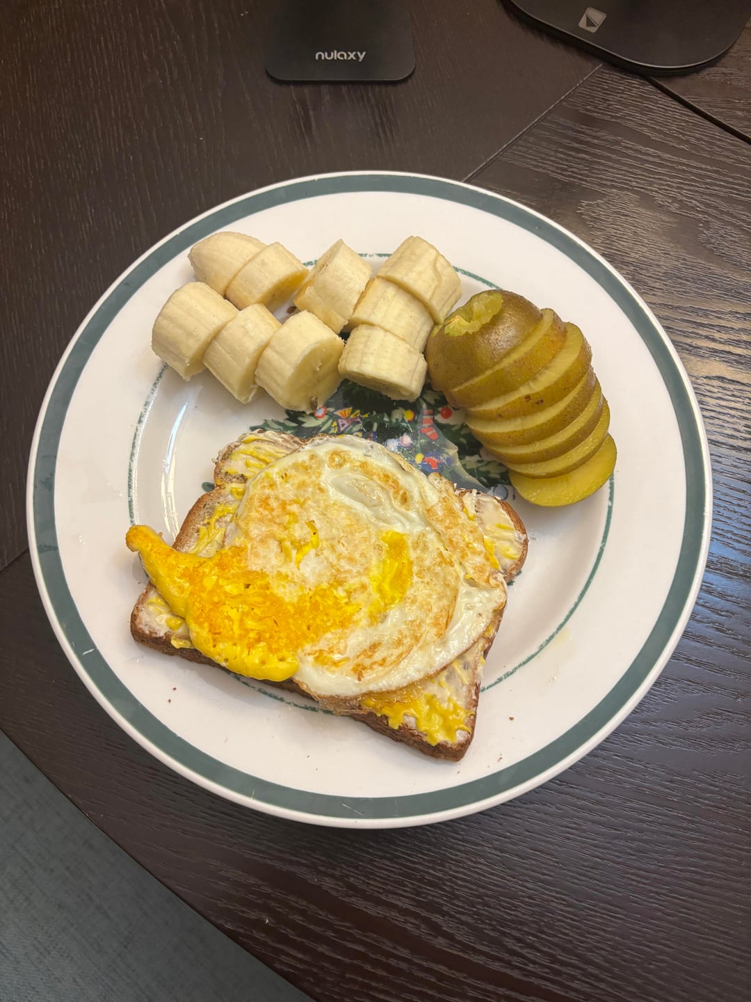 Egg toast with laughing cow cheese wedge, banana, and another fruit