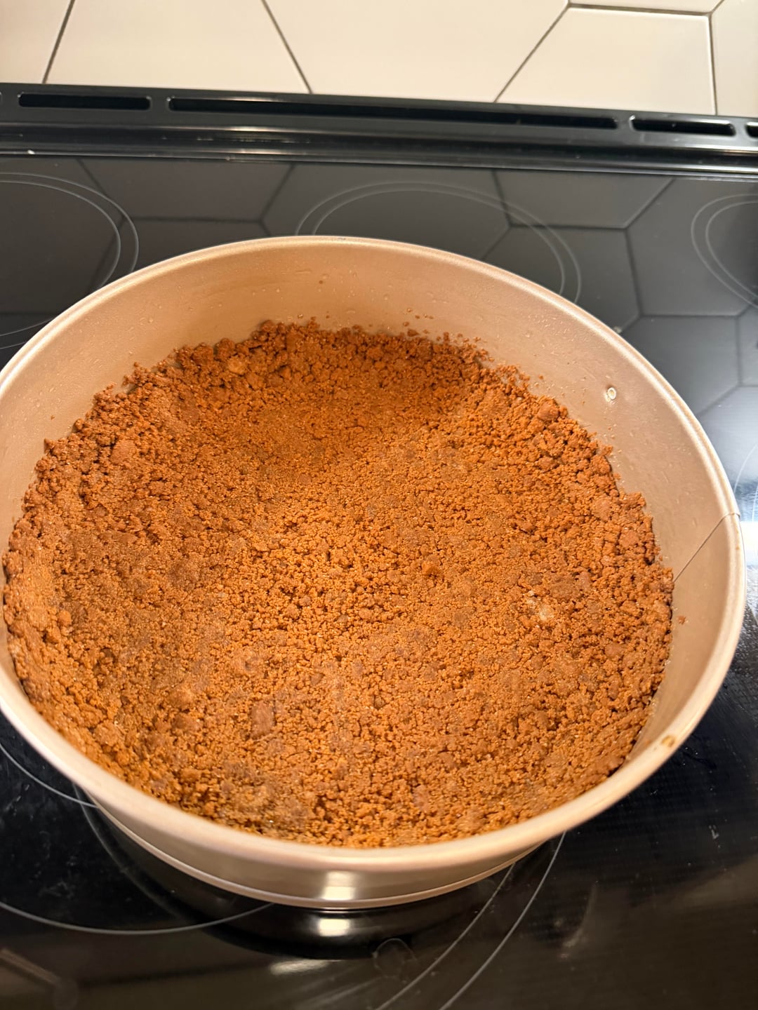 Crust 180 grams of biscoff 2 tablespoons sugar 65 grams unsalted butter melted Mix until wet sandy mixture 9 inch pan Partial crust 1 inch up the sides Cook for 15 minutes
