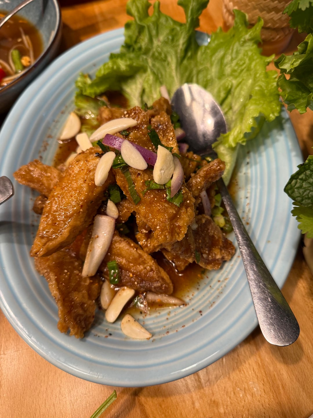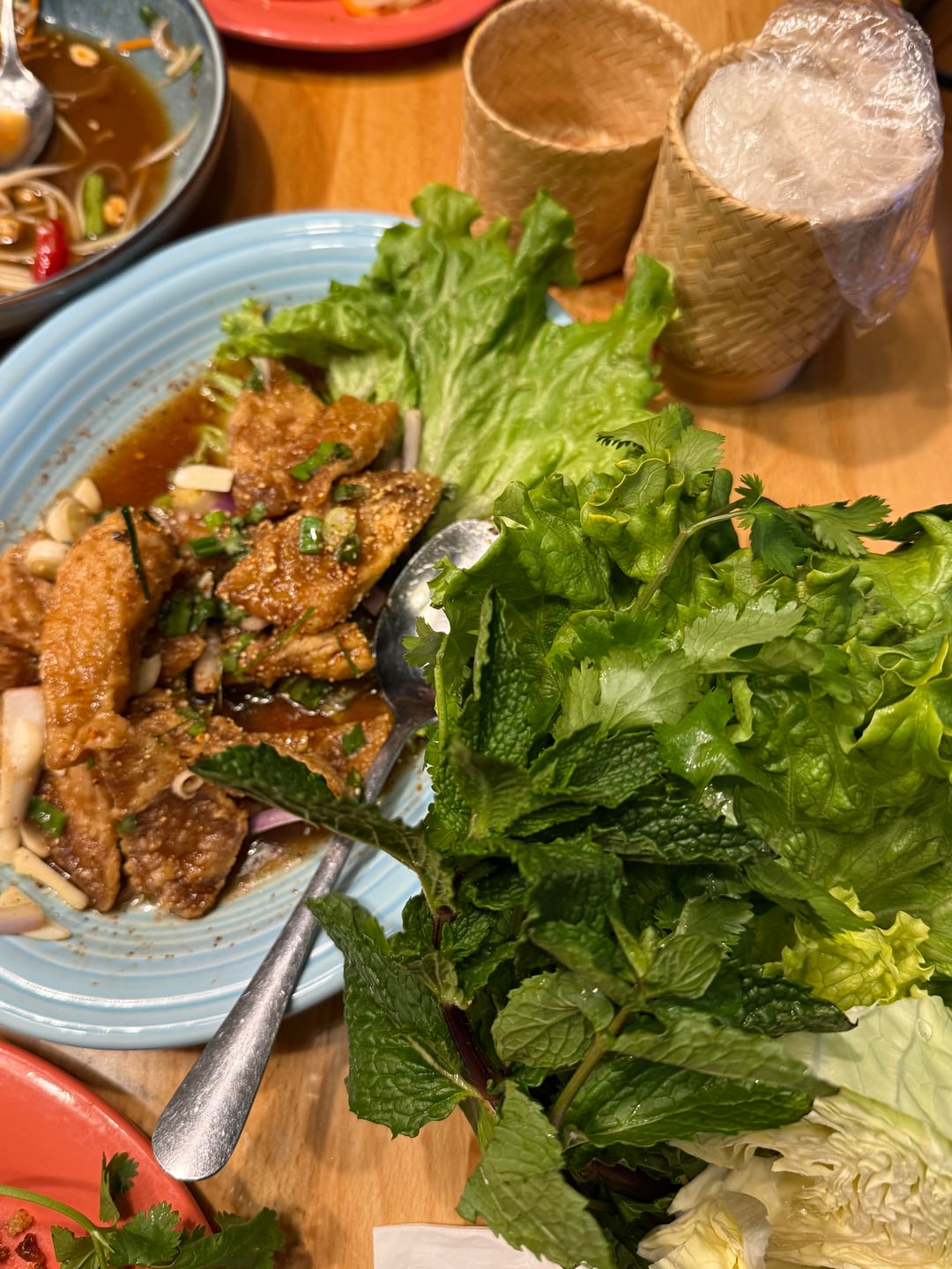 The larb pla is incredible. The fried crust is airy and crispy and gives way to tender hunks of tilapia. It comes with lettuce, herbs, and sticky rice which you can make a wrap with or just eat with rice. Make sure to use the sweet tamarind sauce.