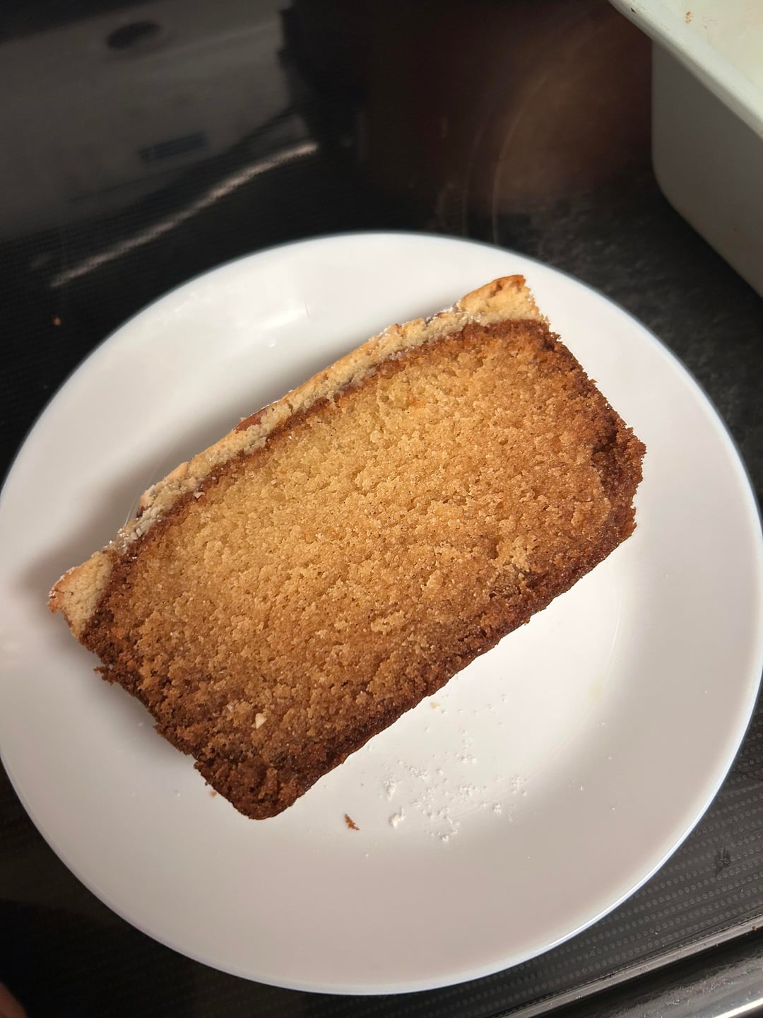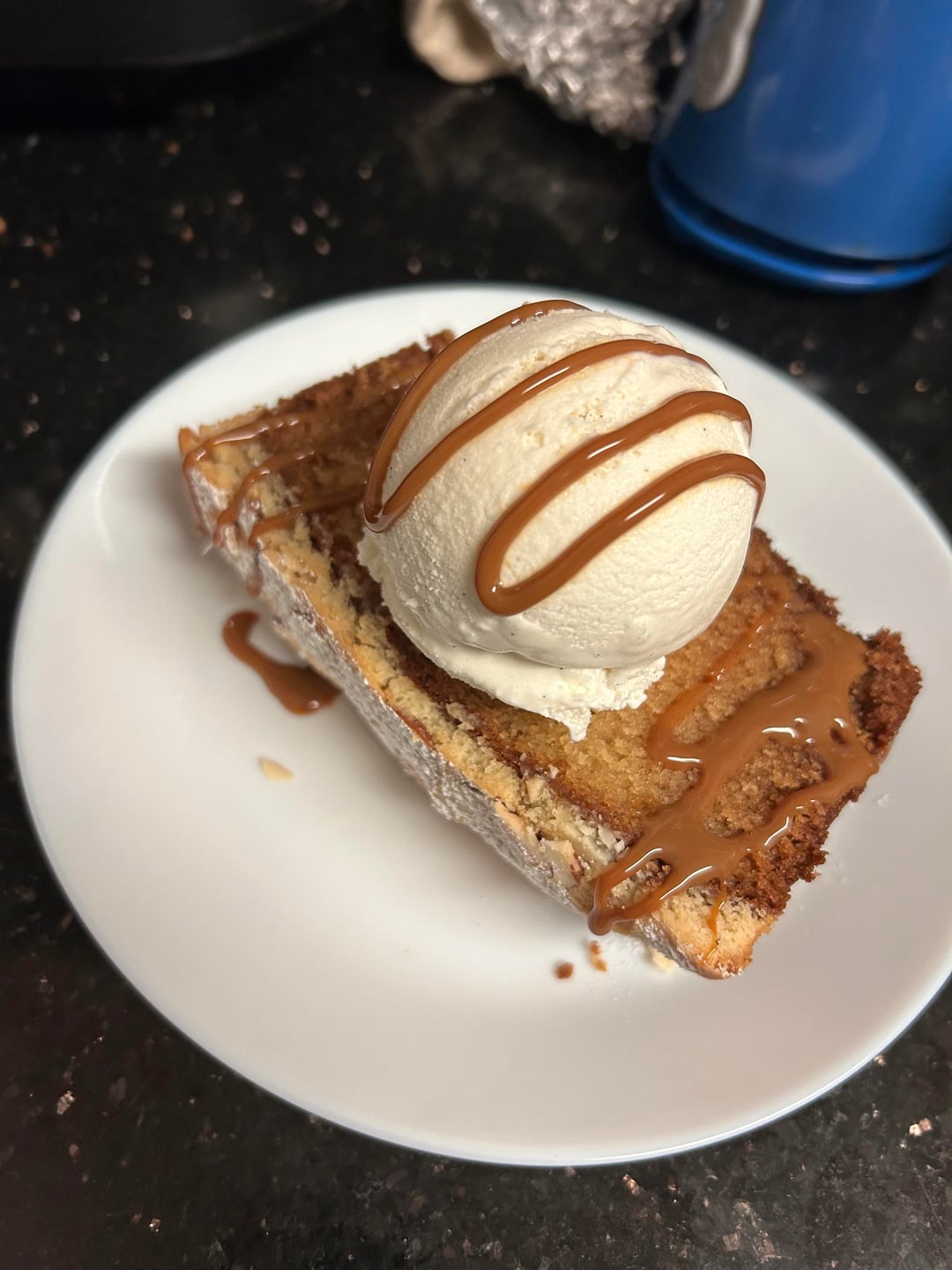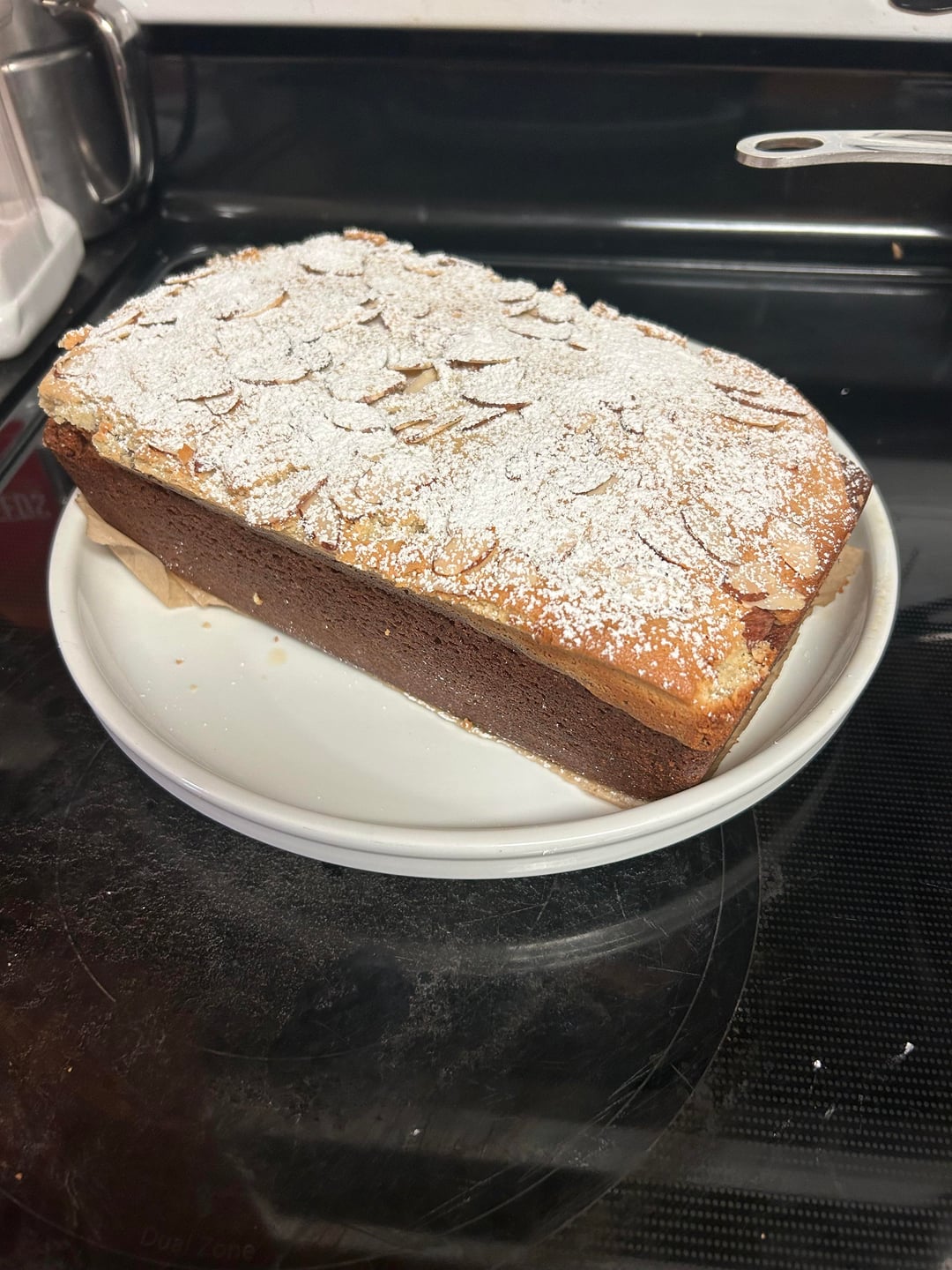 It’s an almond croissant inspired cake. Vanilla bean and almond base with frangipane and sliced almonds on top, with homemade vanilla bean ice cream and dulce de leche