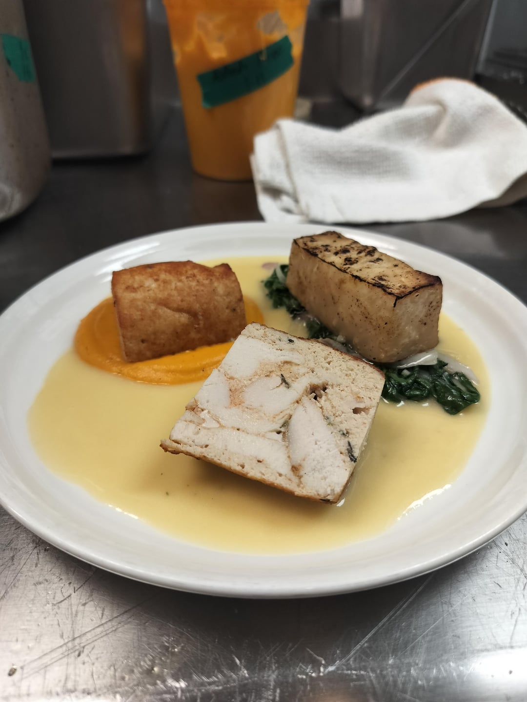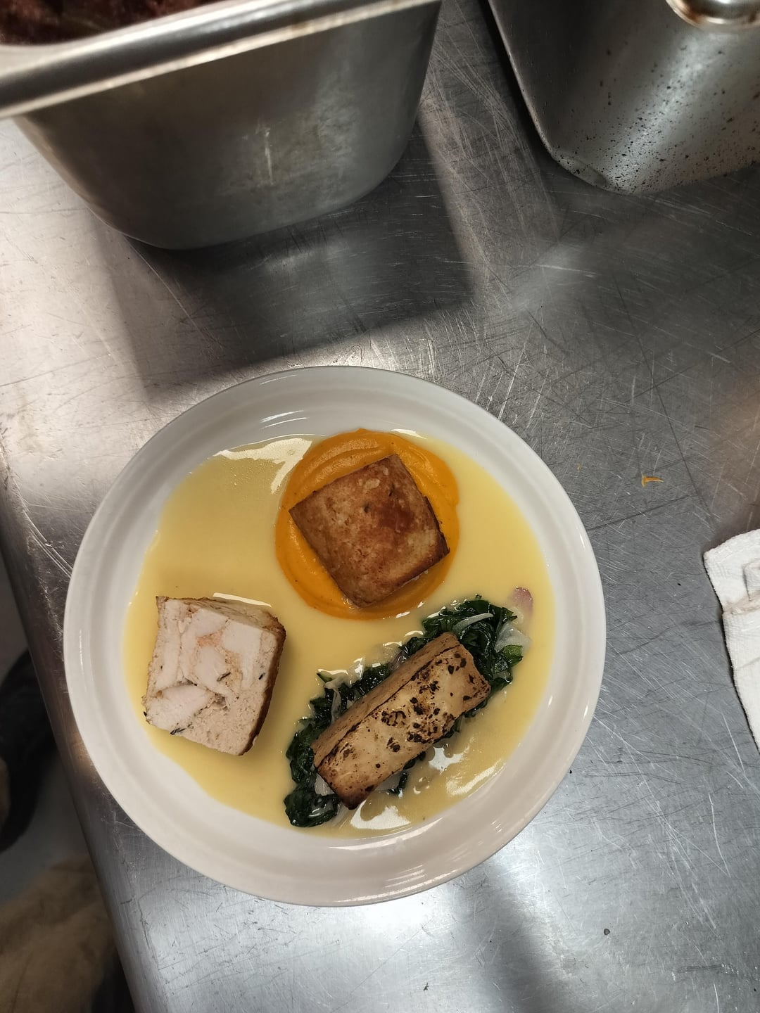 Sous vide (reverse) chx ballotine, roasted red pep and butt squash puree, sauteed arugula shallot and garlic, seared celeriac steamed w chx stock, rosemary, allspice, beurre blanc.