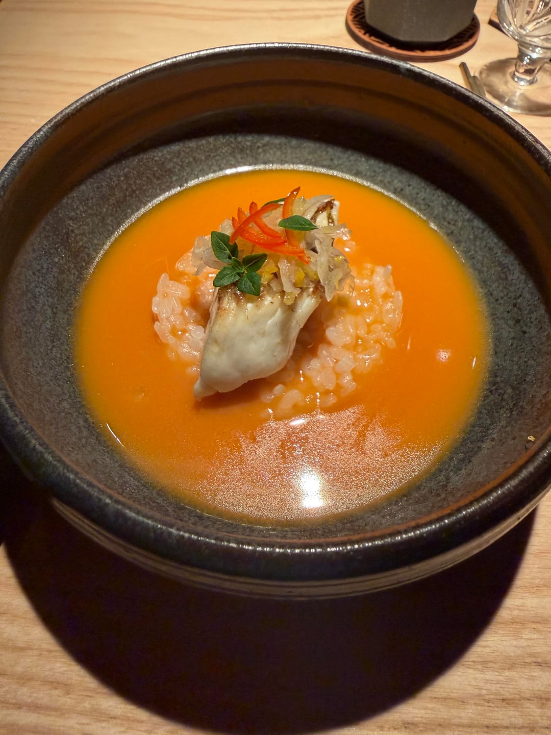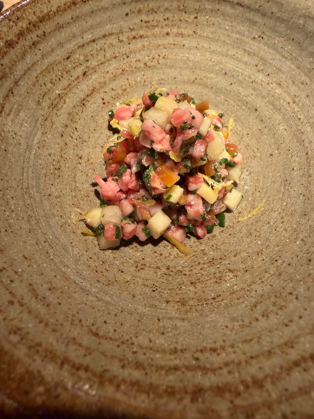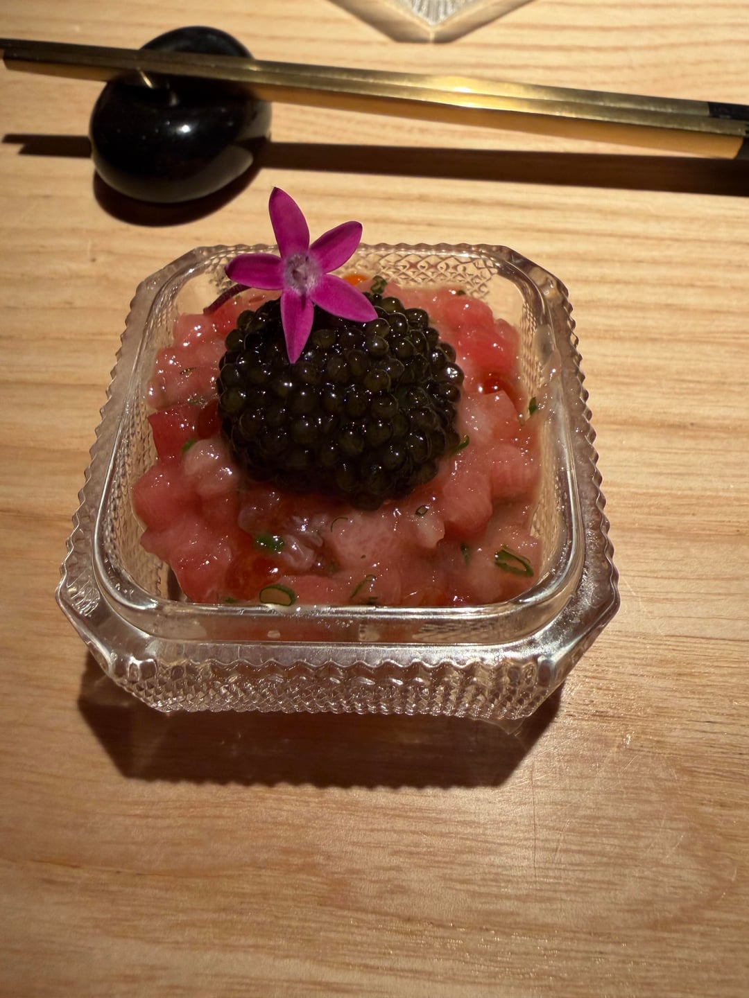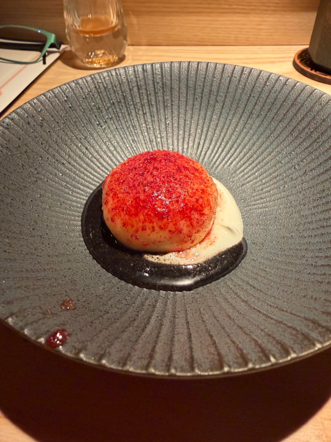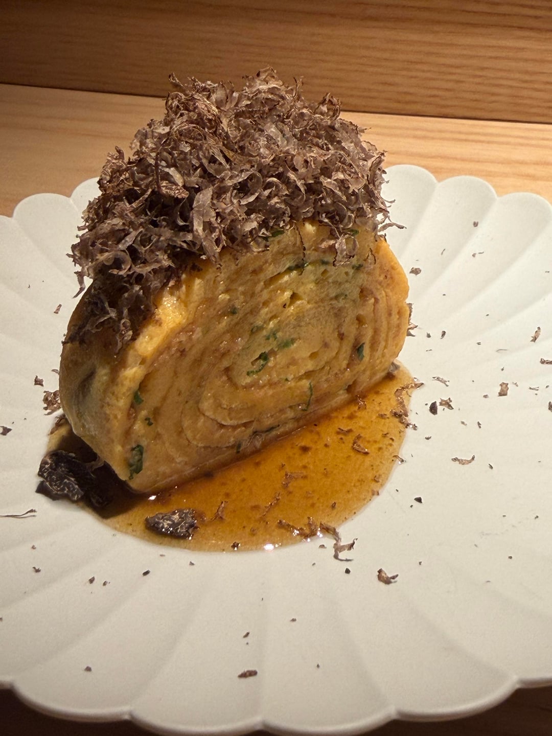 Chawanmushi, wagyu tartare, kinmedai, wagyu, Okinawa potato, tamagoyaki (which was insane), tai, and knedle.