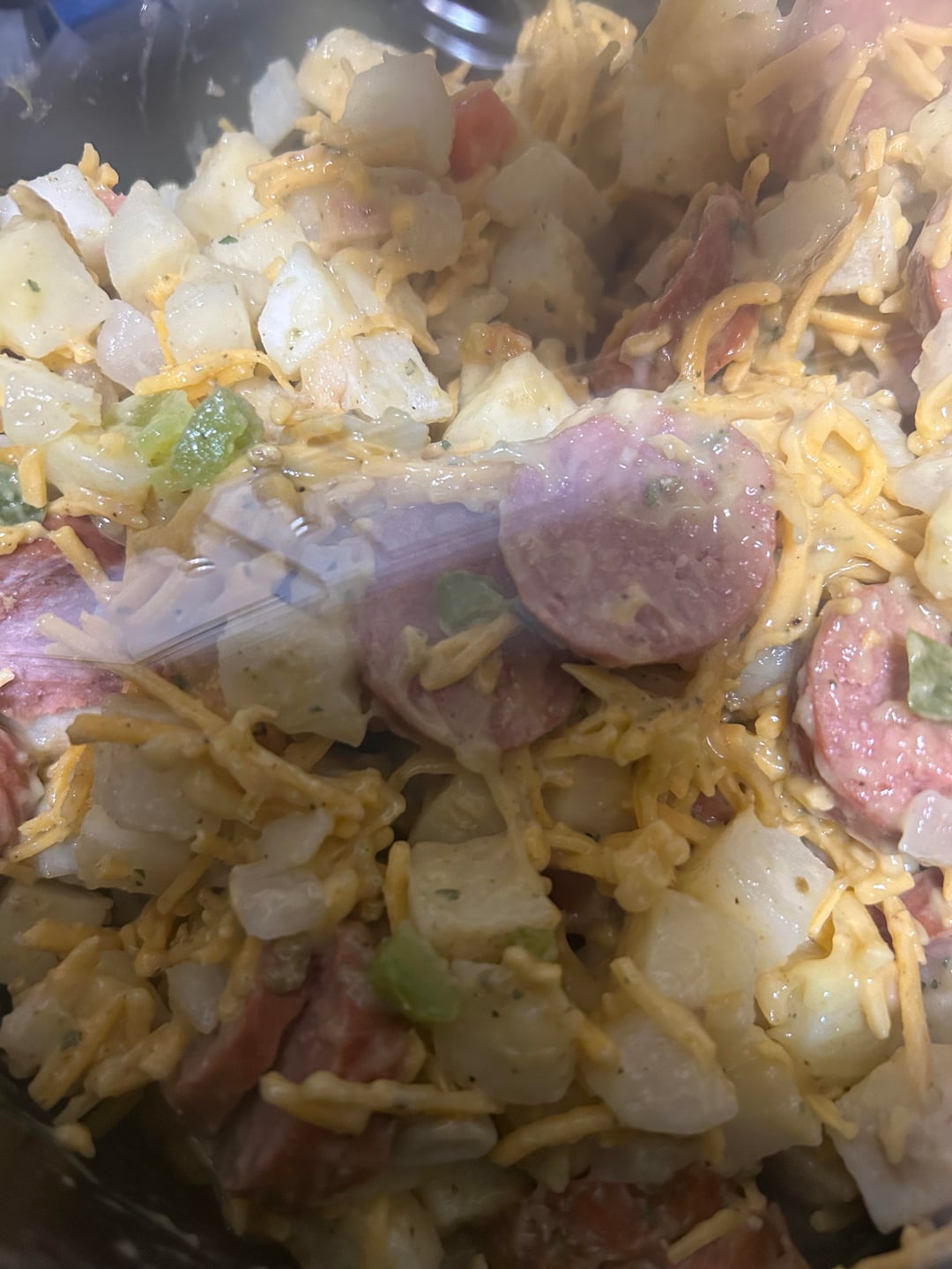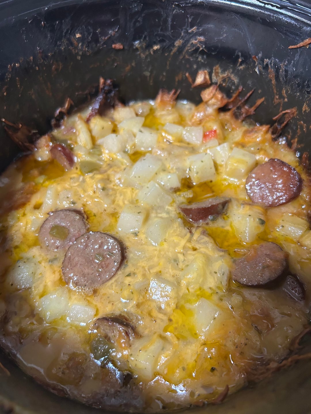 the before, and the 6 slow hours later.28 oz bag potatoes o'brian1 kielbasa, sliced1 can cream of potato or chicken soup1 packet ranch seasoning1 cup shredded cheddar stir everything togethercook on low 4-6 hrs or high 2-3 hrsby kbyyru 2 Comments Straight-Mortgage-29 2 weeks ago Hm. Sounds pretty good. Ever let it go for 8-10h? My work days are normally 12h, but I get to have an early day occasionaly. ButtersHound 2 weeks ago Woof