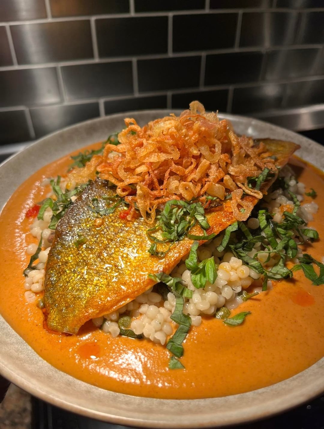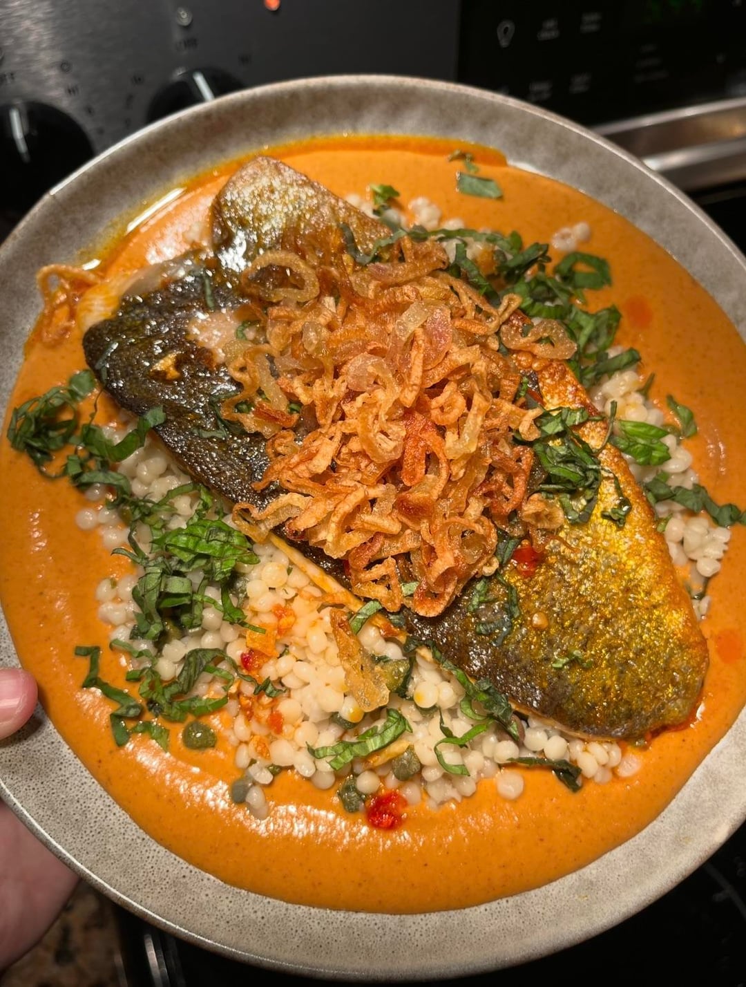 Rainbow Trout, couscous, romesco, Calabrian chili oil, crispy shallotsby pretzelvania444 5 Comments Fuzzy_Welcome8348 16 hours ago Looks amazing! iftheShoebillfits 15 hours ago Do you have a recipe for the romanesco? Looks so good! StallionMang15 13 hours ago Hell yeah! Cherrycokes 9 hours ago Looks incredible! Im eagerly awaiting an invite to tomorrow’s dinner 🙂 Few-Discipline-8824 4 hours ago I’m making this tonight!
