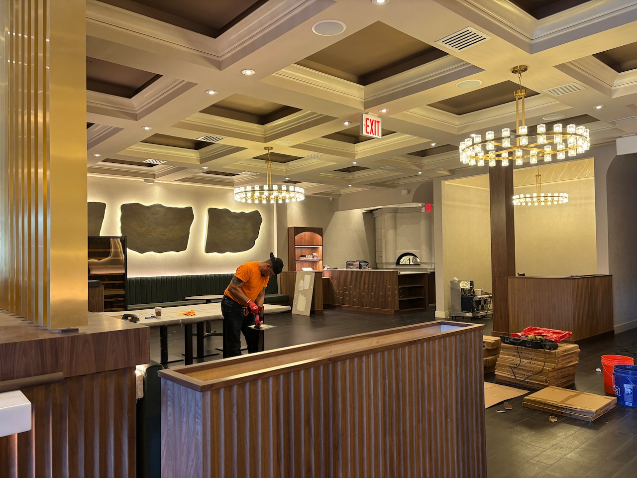 The lounge opens to an outdoor dining area, while the main dining room glows with backlit sculptural wall forms, a refreshed coffered ceiling and a blown‑up image of Palermo, Sicily—the owner’s hometown and the visual emphasis of the redesign. Beyond the dining room is a brand-new, fully outfitted kitchen, completing the transformation. An open‑kitchen corner within the dining room is centered on a pizza oven.