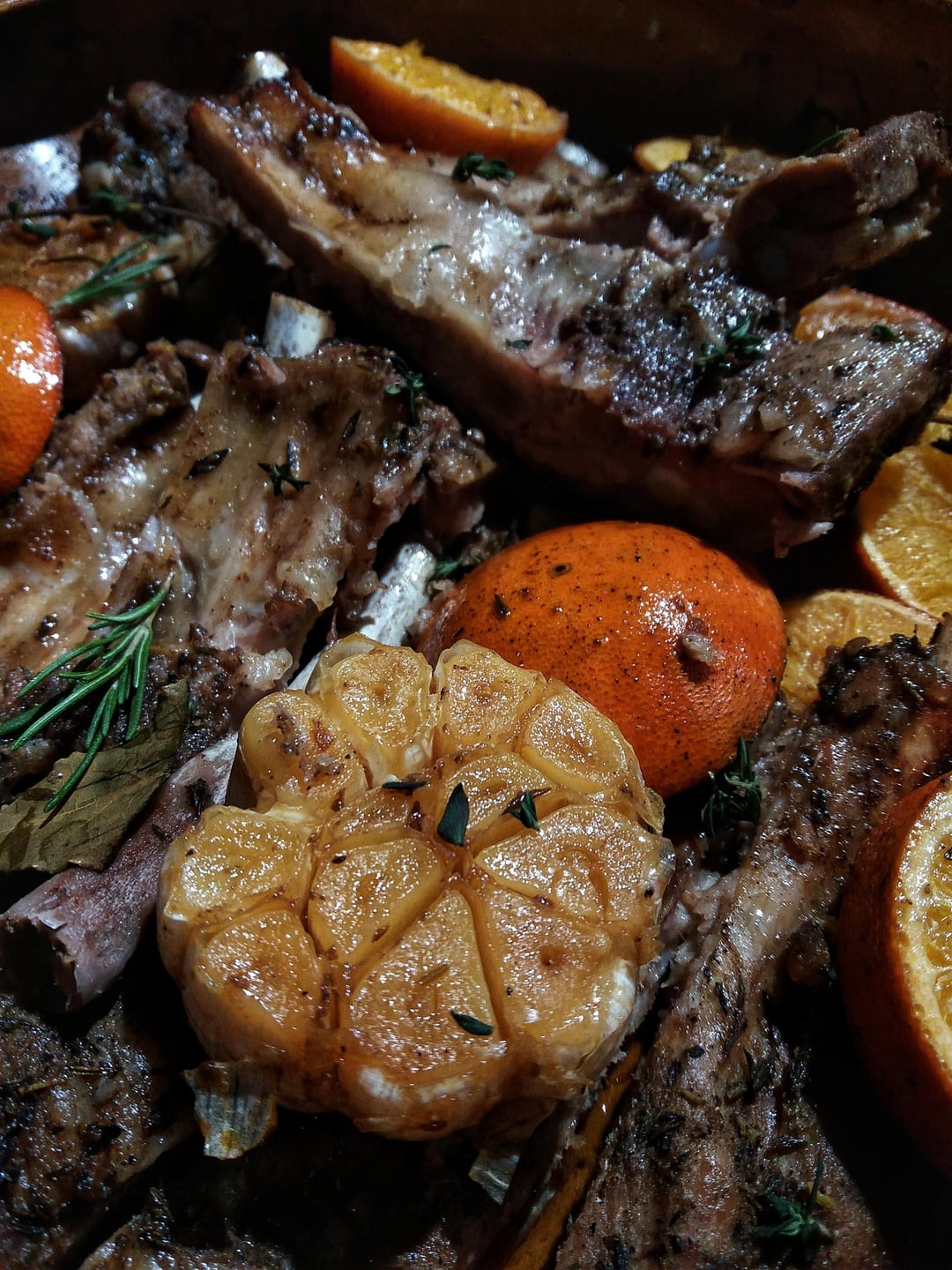 Pork ribs, with oranges, whole garlic and plenty of herbs.