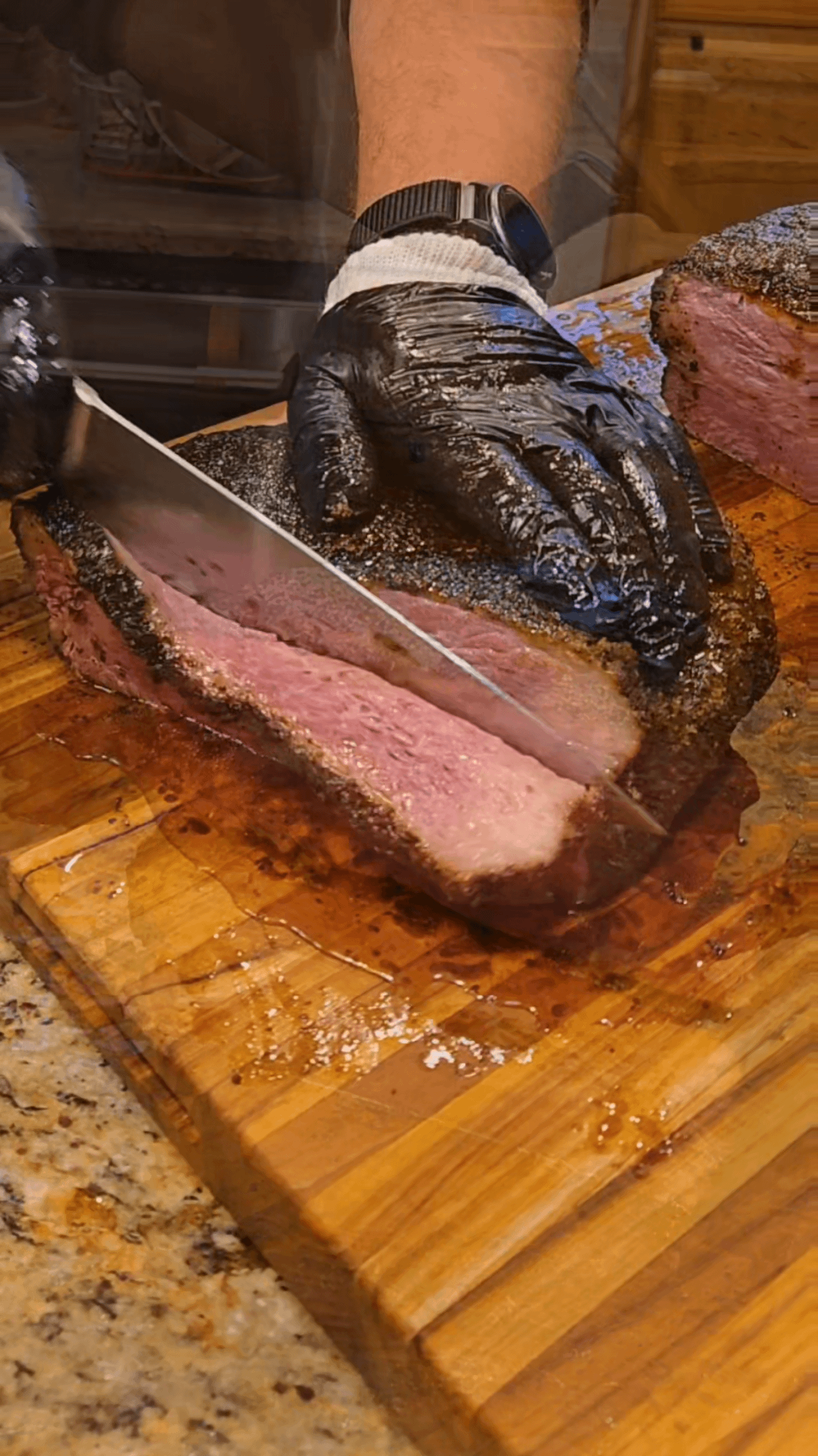 I wonder who the first bbq YouTuber to put on black gloves and stack halves of brisket on top of each other was