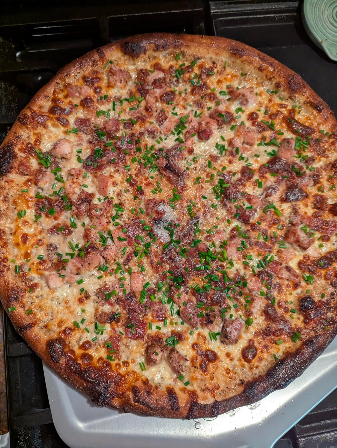 Second one is caesar dressing base, mozzarella, chopped black pepper bacon and chicken thighs, finished with chives after the bake.
