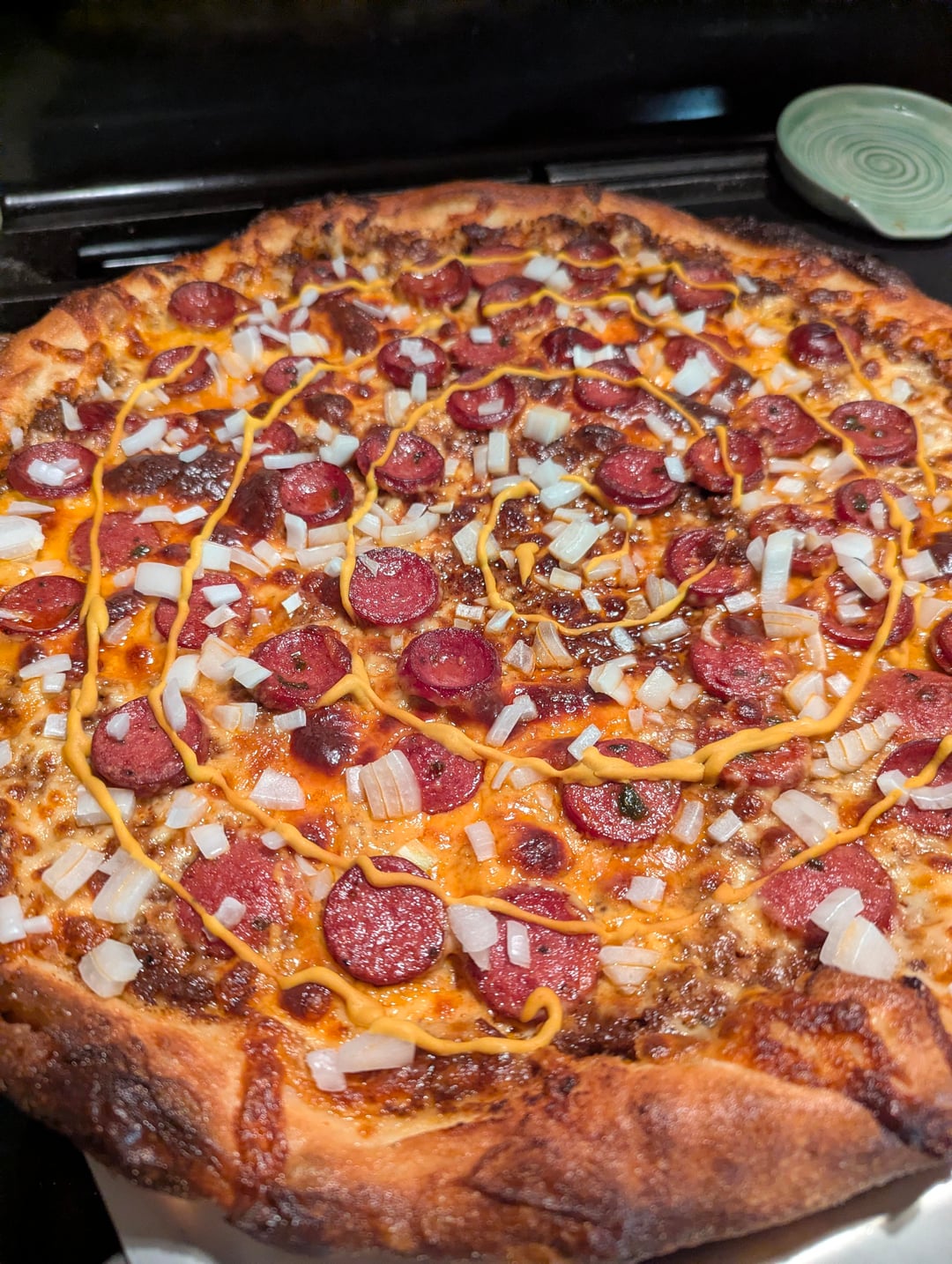 First one is based on a coney dog, so chili as the base with mozzarella/cheddar blend, sliced Polish boy sausages (a local sausage that's basically a spicier hot dog), then finished with white onion and a little mustard after the bake.