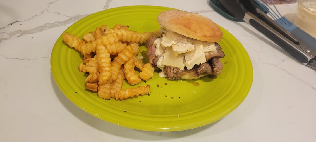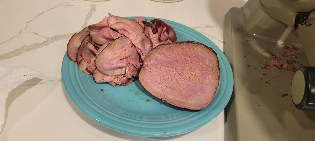 I've made roast beef a number of times but I always smoke it. This time I decided to sous vide it. I picked up a 2.8lb eye round on Thursday and covered it with as much salt as would stick to it. I let it sit in the fridge on a wire rack overnight to dry brine. On Friday evening when I got home from work I fired up the smoker to 700° and seared it. Then, I vac sealed it with butter, Worcestershire, rosemary, thyme, sage, garlic powder, and black pepper. I got it in the water bath around 6pm at 130°. I pulled it out of the bath today at around 3pm, so about 21 hours total. It was amazing. The best roast beef I've ever made. Only thing I'd do differently is go a little lower next time. Maybe 125°. I also made homemade buns. The buns were good but next time I'll let them proof a little longer before baking and bake for a few more minutes. Also, the everything bagel seasoning just kind of fell off when I cut them open. Oh, and the buns are gluten free. My oldest has celiac so the whole house is gluten free. It's just easier that way. I strained the juices from the bag and made gravy to dip the roast beef in before piling on the rolls. My sandwich has slices of a cheddar gruyere cheese and horseradish sauce.