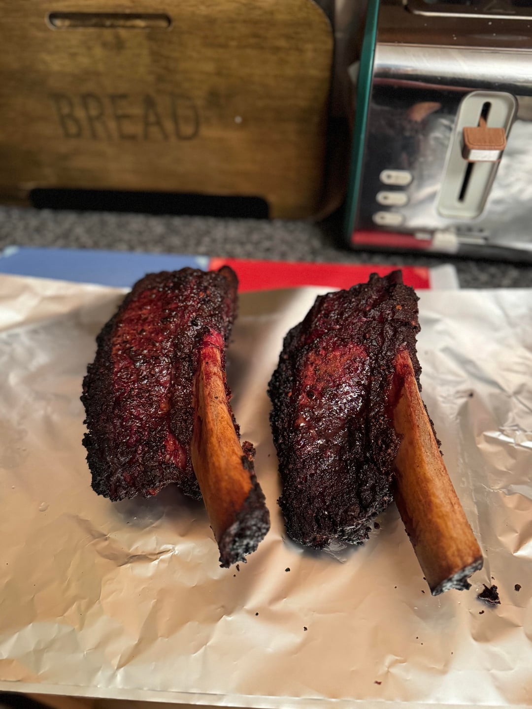 5 hours at 275. Smoked with pecan and apple wood. Pulled at 200 internal to rest by Intelligent-Beach-59 5 Comments Any_Witness_2429 1 day ago Wow! That’s legit! Great job!!! newaccount_2020 1 day ago Did you wrap them at all? ettonlou 1 day ago Beef plate short ribs are probably my favorite. So beefy and rich. Ocean420Serenity 1 day ago Nice 🙌 MidwestAbe 1 day ago You trim/cut them after cooking?