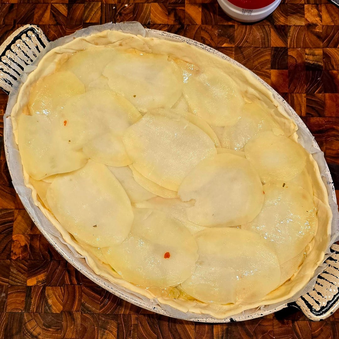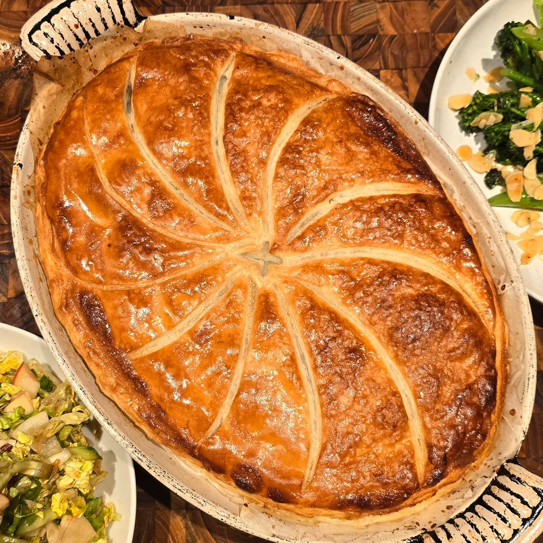 Method: Par-boil potato slices in veg stock (3 mins). Dry well. Sweat leeks until melting. Make a thick béchamel with the miso/garlic. Mix. Cool completely. Brush base pastry with mushroom ketchup (secret umami weapon). Layer potatoes and leek mix into a dome. Seal with top pastry. Score, glaze, and bake at 200°C for 40 mins.