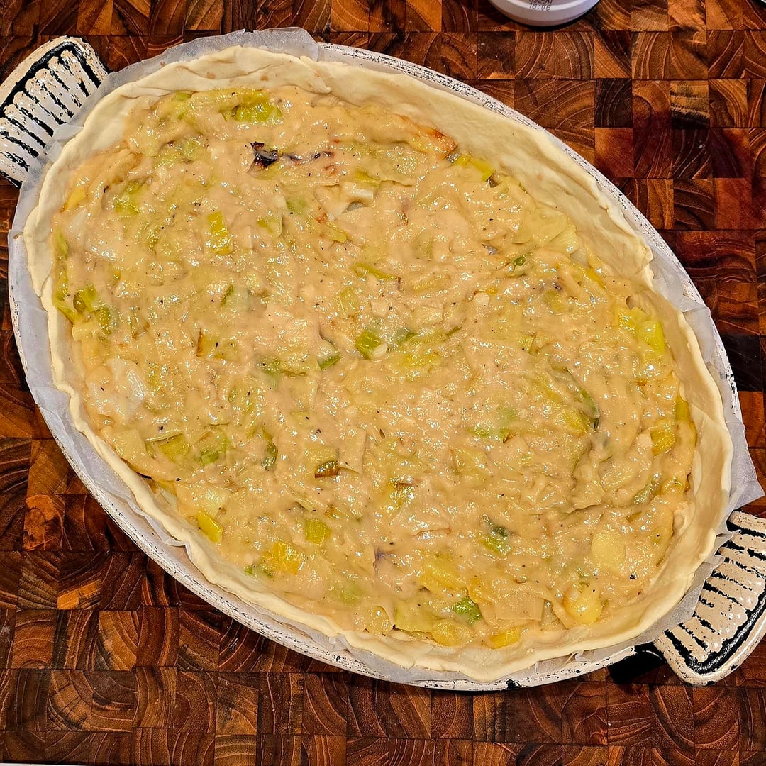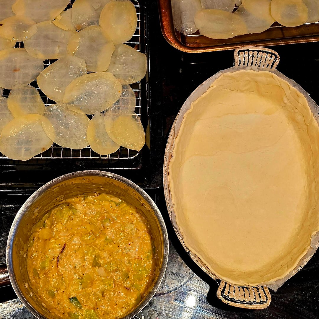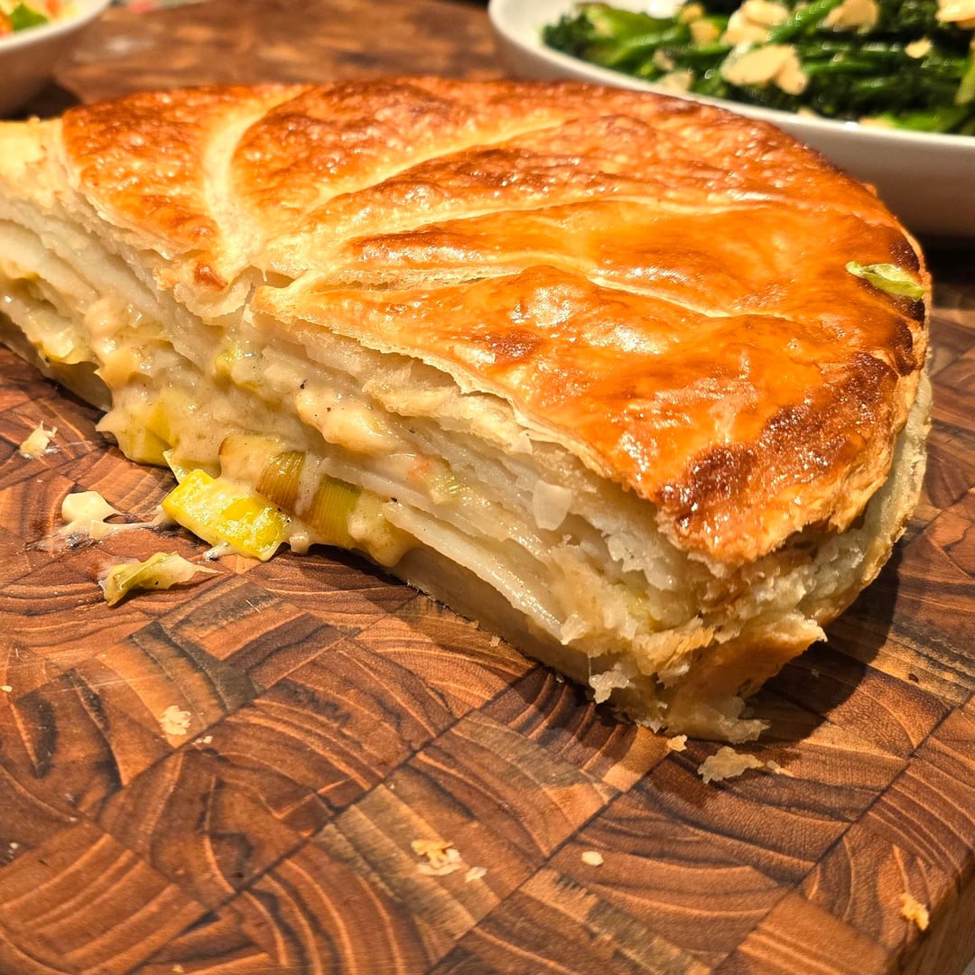 Ingredients: 3 Large Maris Piper Potatoes (sliced 3mm) 3 Leeks (confited in vegan butter/thyme) Puff Pastry Sauce: Soy milk, flour, butter, white miso, smoked garlic, nutritional yeast.
