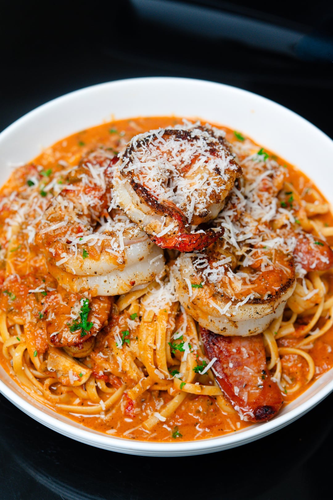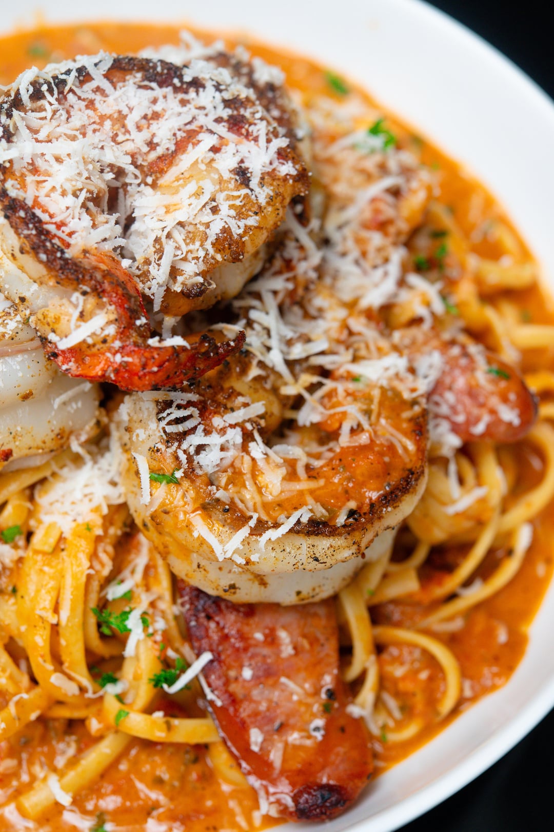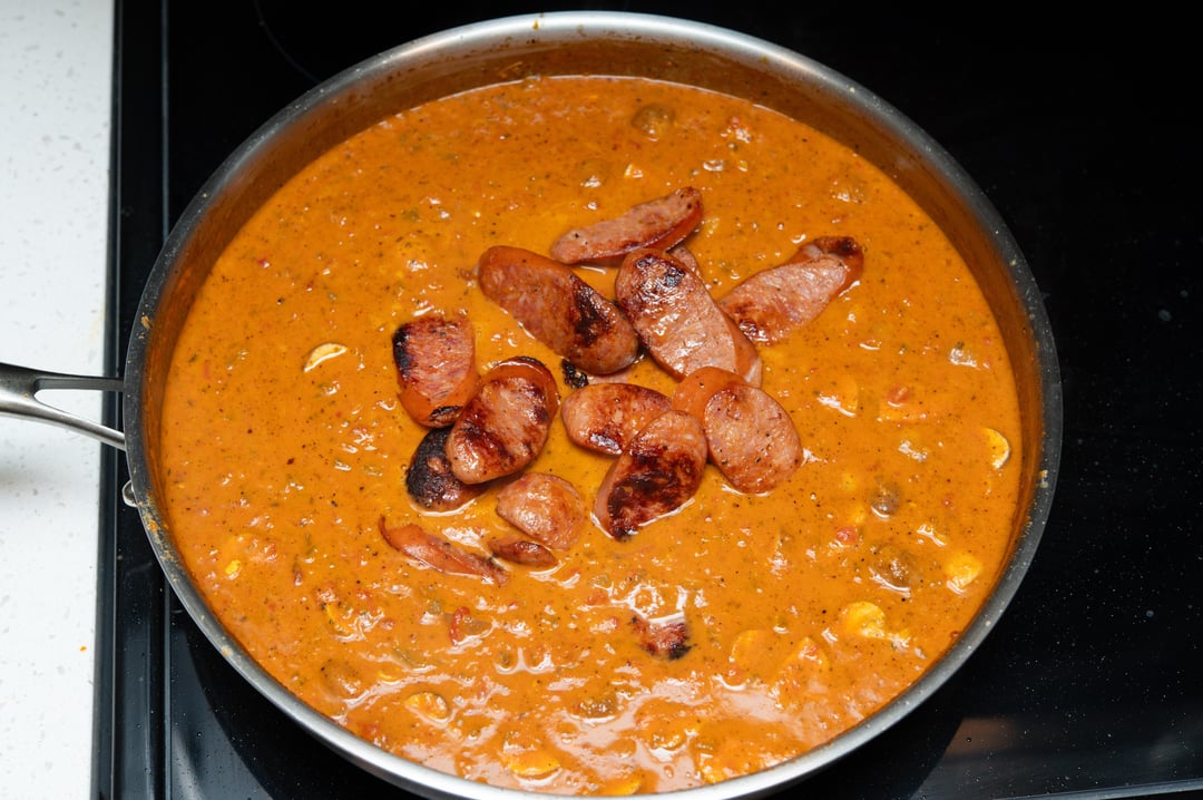 Bell pepper, shallot, garlic, sun-dried tomatoes, crushed tomatoes, heavy cream, grated Parmesan, shrimp, crawfish meat, andouille sausage and mushrooms.