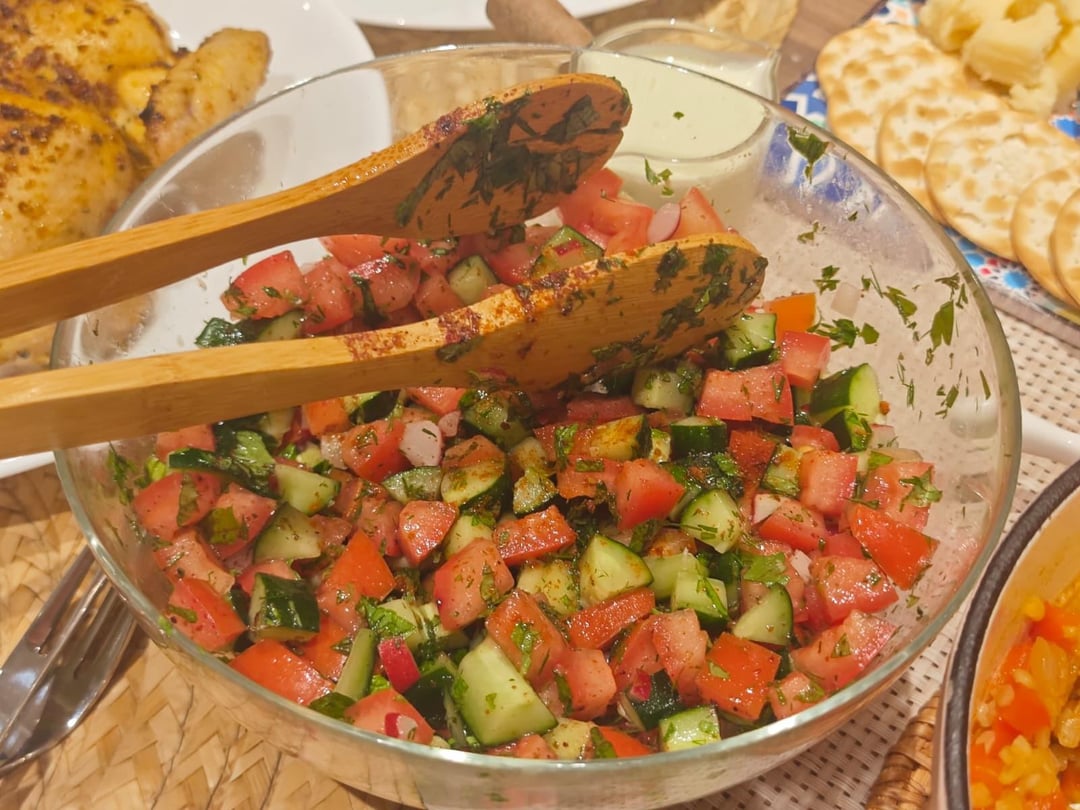 Cucumber and tomato salad with parsley, mint and dill