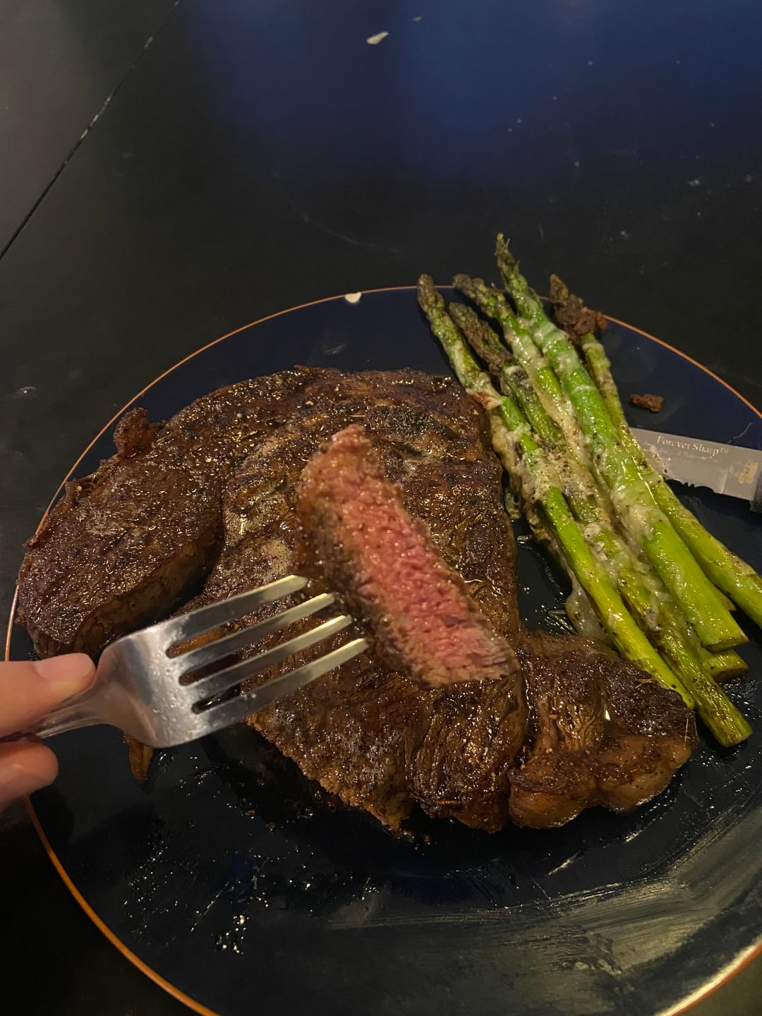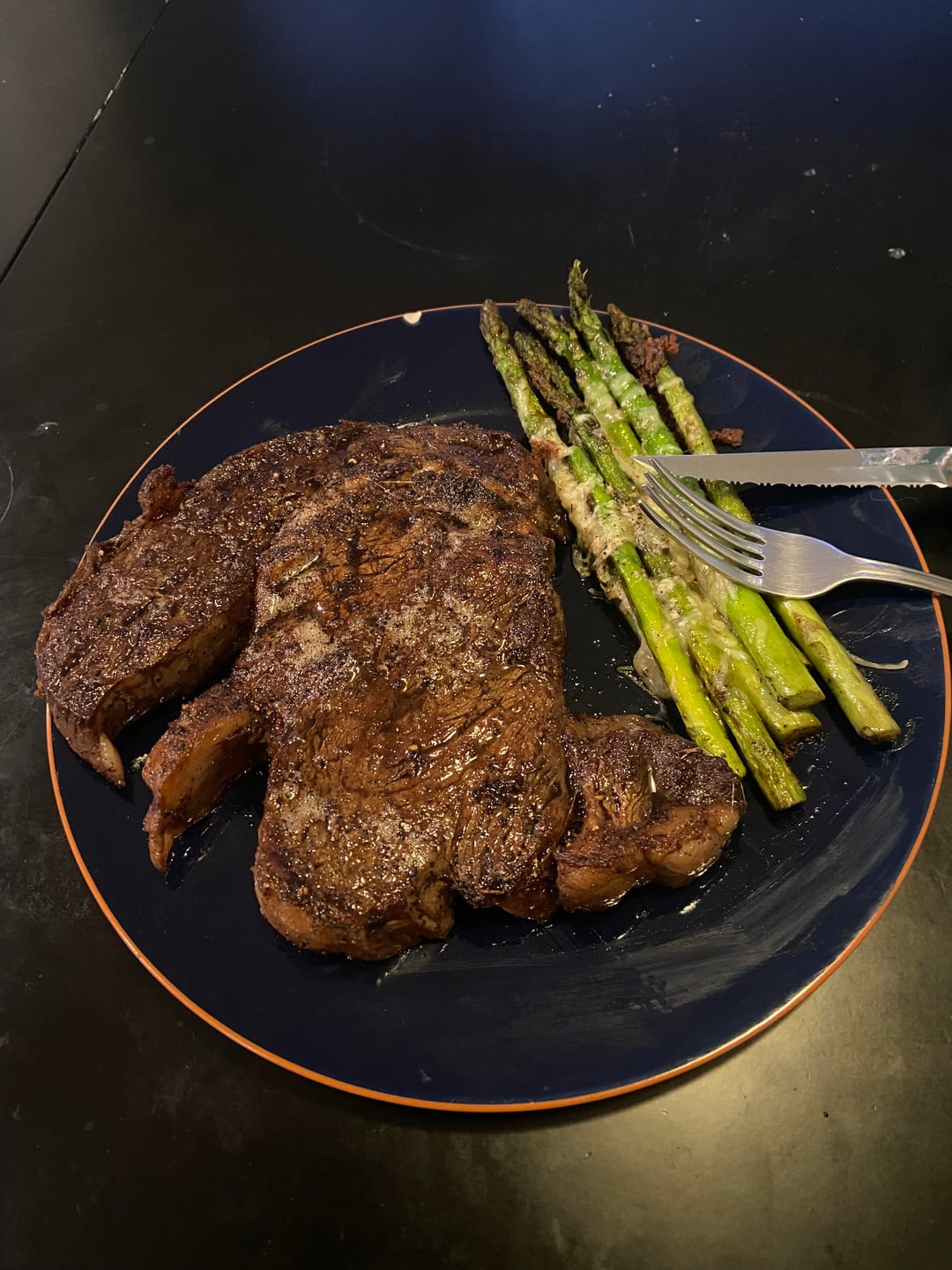 Medium rare ribeye with asparagus is a classic combination.