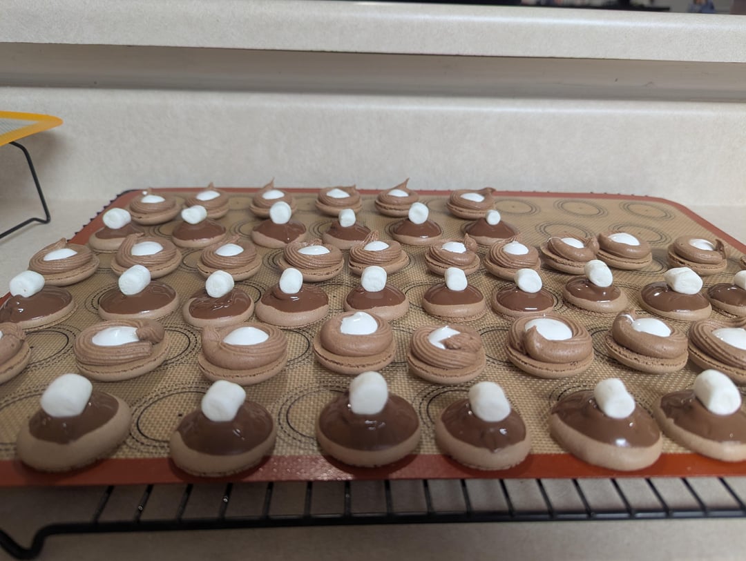 Hot chocolate macarons. Chocolate shells with a hot chocolate buttercream and a marshmallow fluff middle. Topped with melted chocolate and a mini marshmallow! by merrygentry 1 Comment IzzieMck 3 months ago Nice! 👍🏼