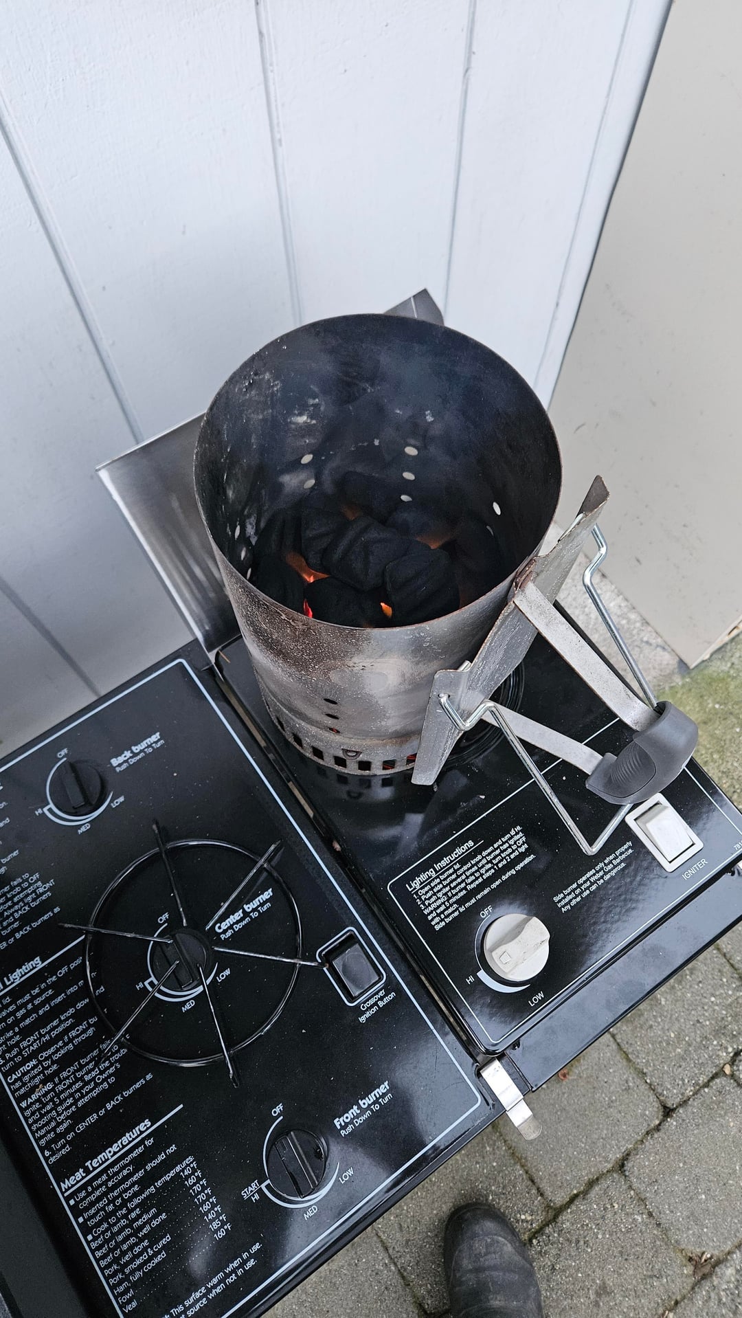 When you light your chimney with the side burner do you leave it on there until finished? Any pros or cons?