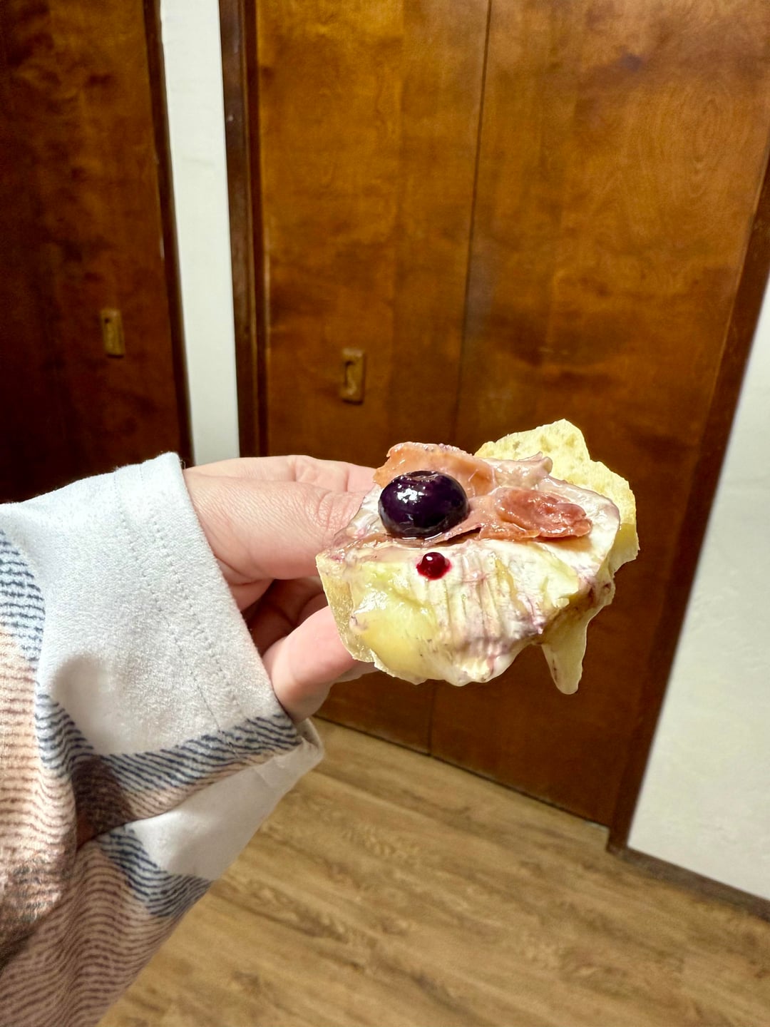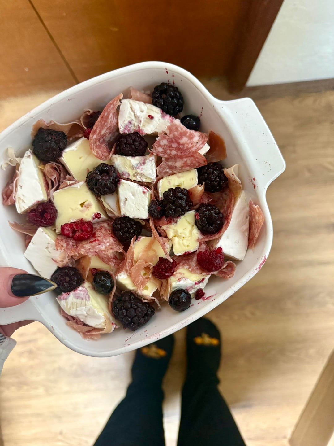 this is basically drunk charcuterie and im not mad at it. cheese meat berries looks messy but probably hits after a few drinks, id eat the whole thing straight out the bowl