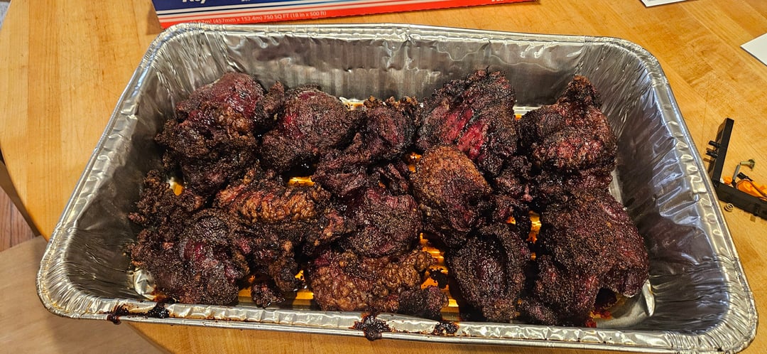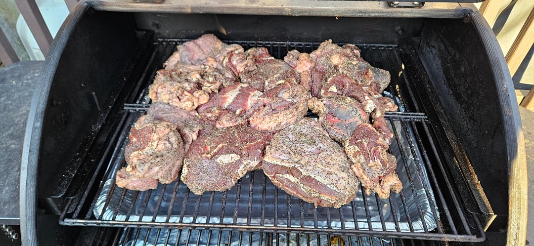 Pellet grill 3hrs @ 285°. Wrapped and braised with beef stock for 3 more hours @ 285°. Rested overnight. Reheated, pulled, pressed, devoured. 100% I'll make again.