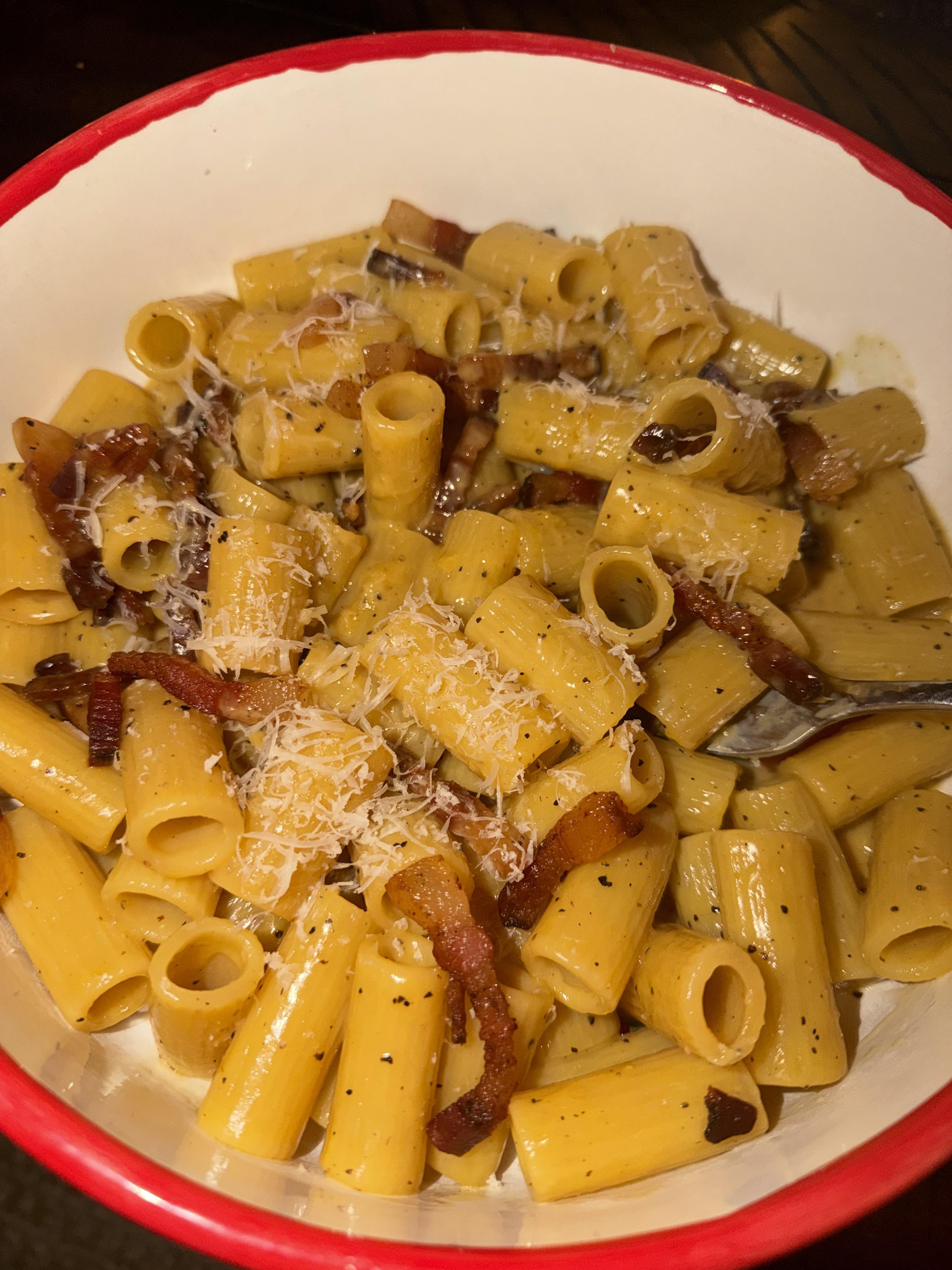 Made Carbonara in my new saucier last night. Simply the best pasta ever!!!by houseofcrouse 8 Comments noorderlijk 2 weeks ago This looks remarkably good! TradingIrish1006 2 weeks ago This looks great, fancy a bowl of pasta now myself! bilbul168 2 weeks ago Was he from san Anton? Ok_Dream_1417 2 weeks ago Looks delicious! I had to google what a saucier pan was. I’ve never heard of that. 1ntr1ns1c44 2 weeks ago Yeah yum🍽️ carlofromsicily 2 weeks ago Why would you bother eating out when you’ve got this at home ! 1853624 2 weeks ago Looks great! Have you ever made the Indian version? Masala Pasta is a great alternative. FlirtyFlameeMariaa 2 weeks ago New saucier already paying for itself. That pasta looks insanely good.