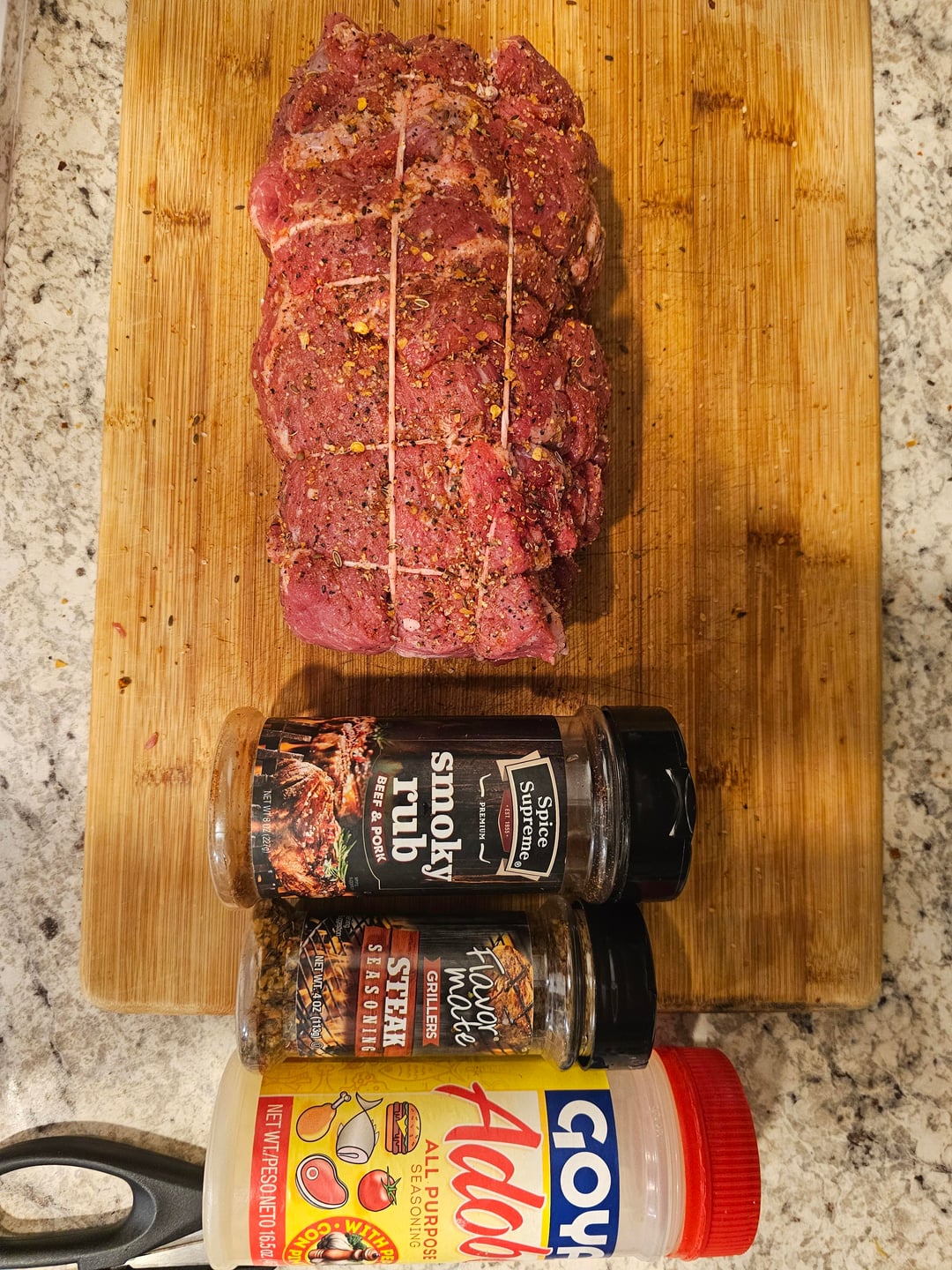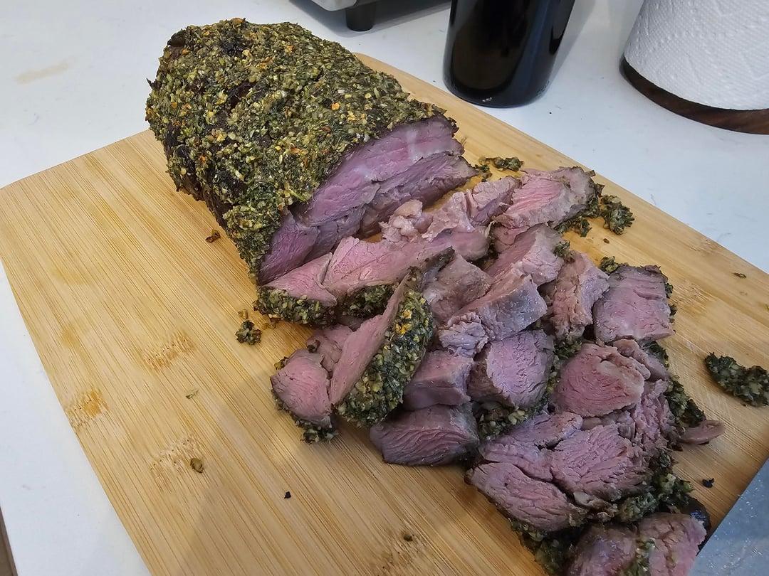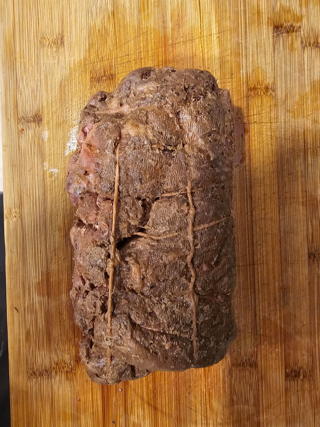 I bought 2 Walmart choice chuck roast ($6.79 / lb). I broke them down and removed excess fat and silver skin, seasoned all the pieces with Adobo and tied them all together. Outside crust paste consisted of home grown garlic cloves, rosemary, oregano, sweet basil, parsley and store bought steak seasoning chopped cosrse in the food processor.