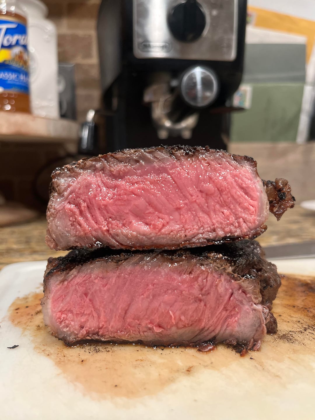 Heavy salt and in the fridge for about 4 hours. Brought it back to room temp and seared on a screaming hot stainless steel pan.by BruhBoy 11 Comments petalsvenom 2 weeks ago No sauce needed for that 🤤 candynipples 2 weeks ago Holy fucking sear, gorgeous. Grey band is tiny. No kidding when you say that pan was piping hot dbeast64 2 weeks ago Beautiful 🥹 NumberVsAmount 2 weeks ago I’m proud of you too puchicavos 2 weeks ago Gotta go with lower heat and shoot for a dark brown instead of burnt black Realistic-Fact-2584 2 weeks ago That’s strong right there. KaminaTheManly 2 weeks ago That’s not a sear, that’s burnt… idfc1337 2 weeks ago Other than the steak being a lil burnt it looks great. BKPATL 2 weeks ago 💯👍🏻 Mfw_Pigeon 2 weeks ago Solid temp but as others have said that’s a little more than a crust. What kind of oil did you use? dgraveling 1 week ago You should be!!!