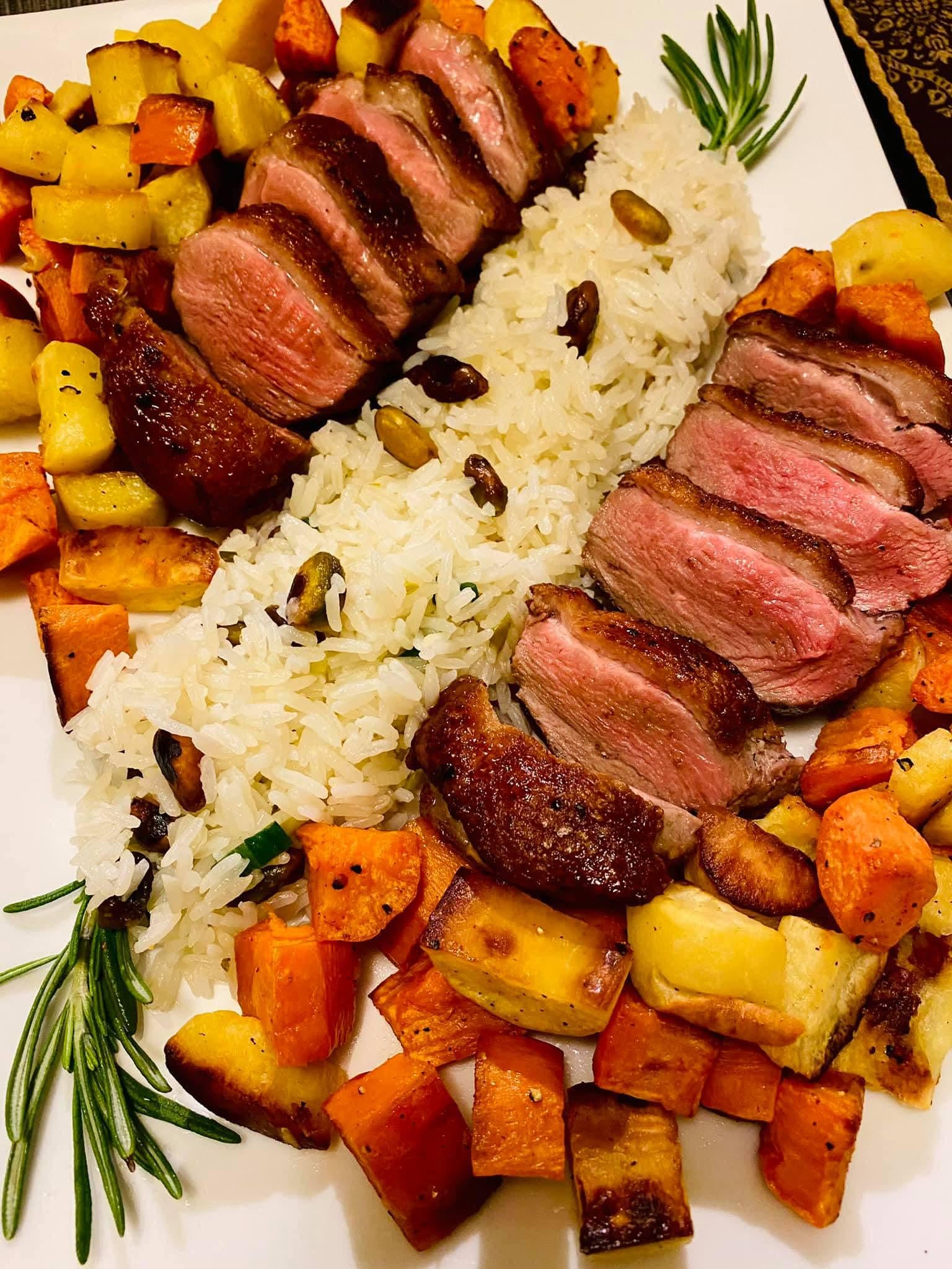 Pan-fried duck breast in cherry jam sauce, rice, roasted sweet yams and potatoes