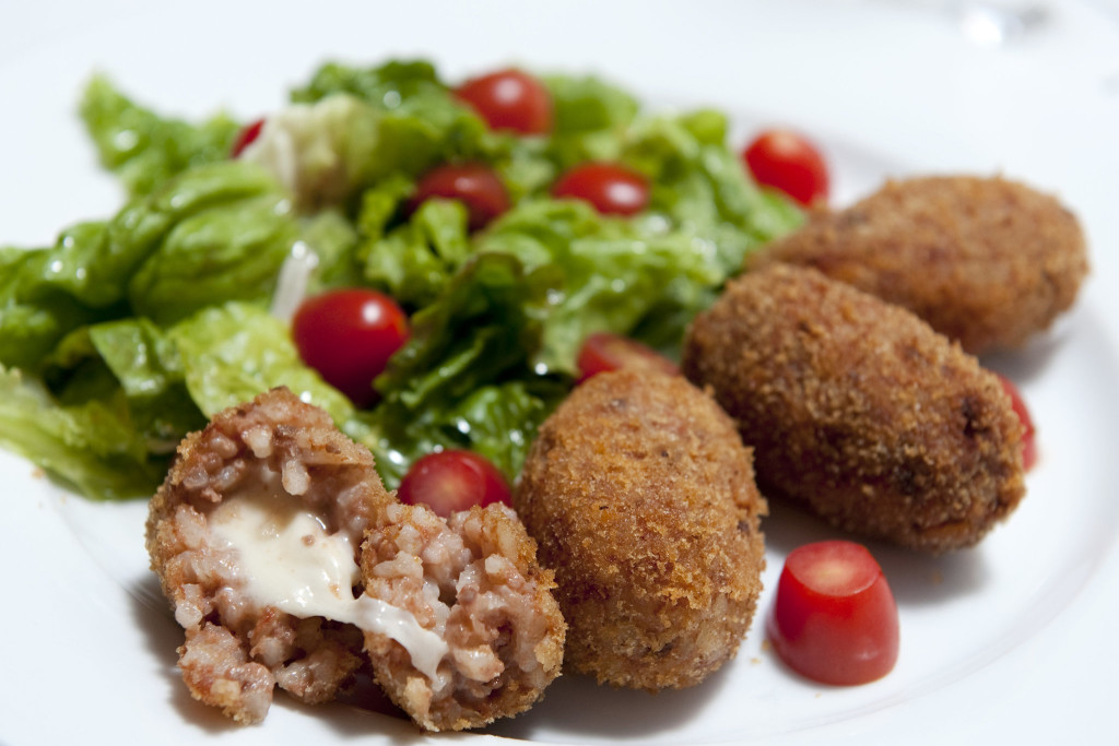 Supplì al telefono are rice balls stuffed with ground meat and mozzarella, then breaded and fried. They are a classic Roman snack. Serve them as an appetizer, and pair them with an aperitif like Prosecco or Campari.