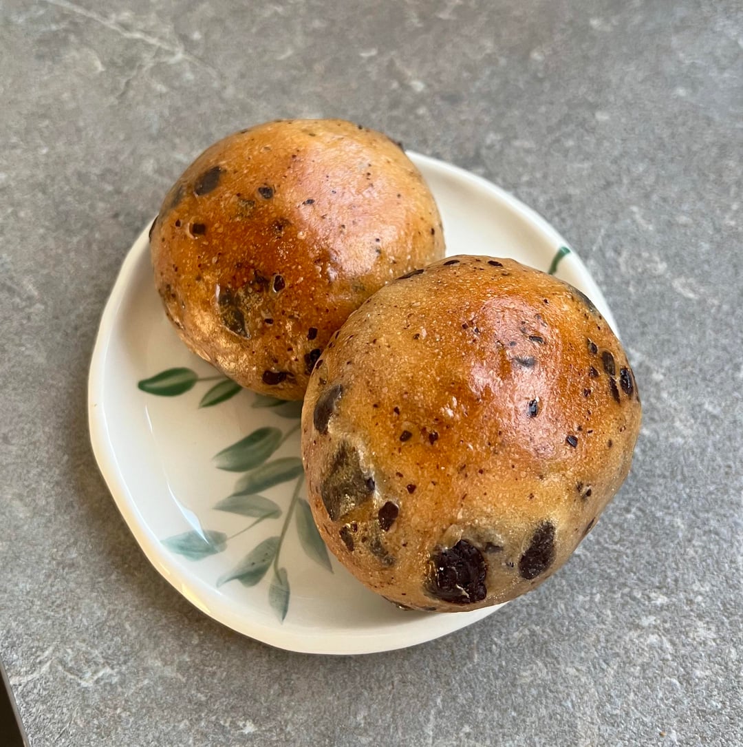Homemade chocolate bun and coffee for breakfast and a Mediterranean mix for lunch. Homemade feta and olive dip with zatar, cucumber, bell pepper, dill, store bought stuffed grape leaves and bread, pickled jalapeño and a small salad