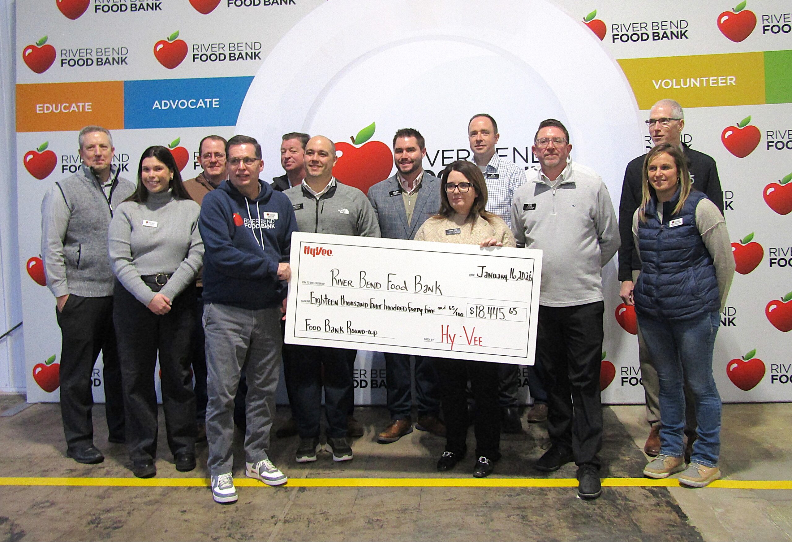 A group of Hy-Vee grocery store officials arrived at the River Bend Food Bank in Davenport on Friday, Jan. 16. They gathered near a sign that stated “We have a passion for ending hunger.”