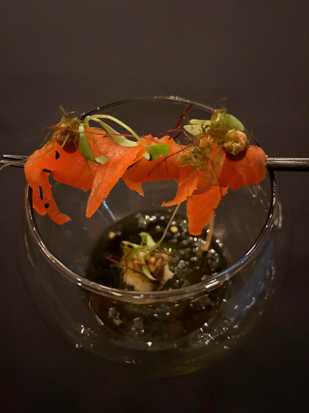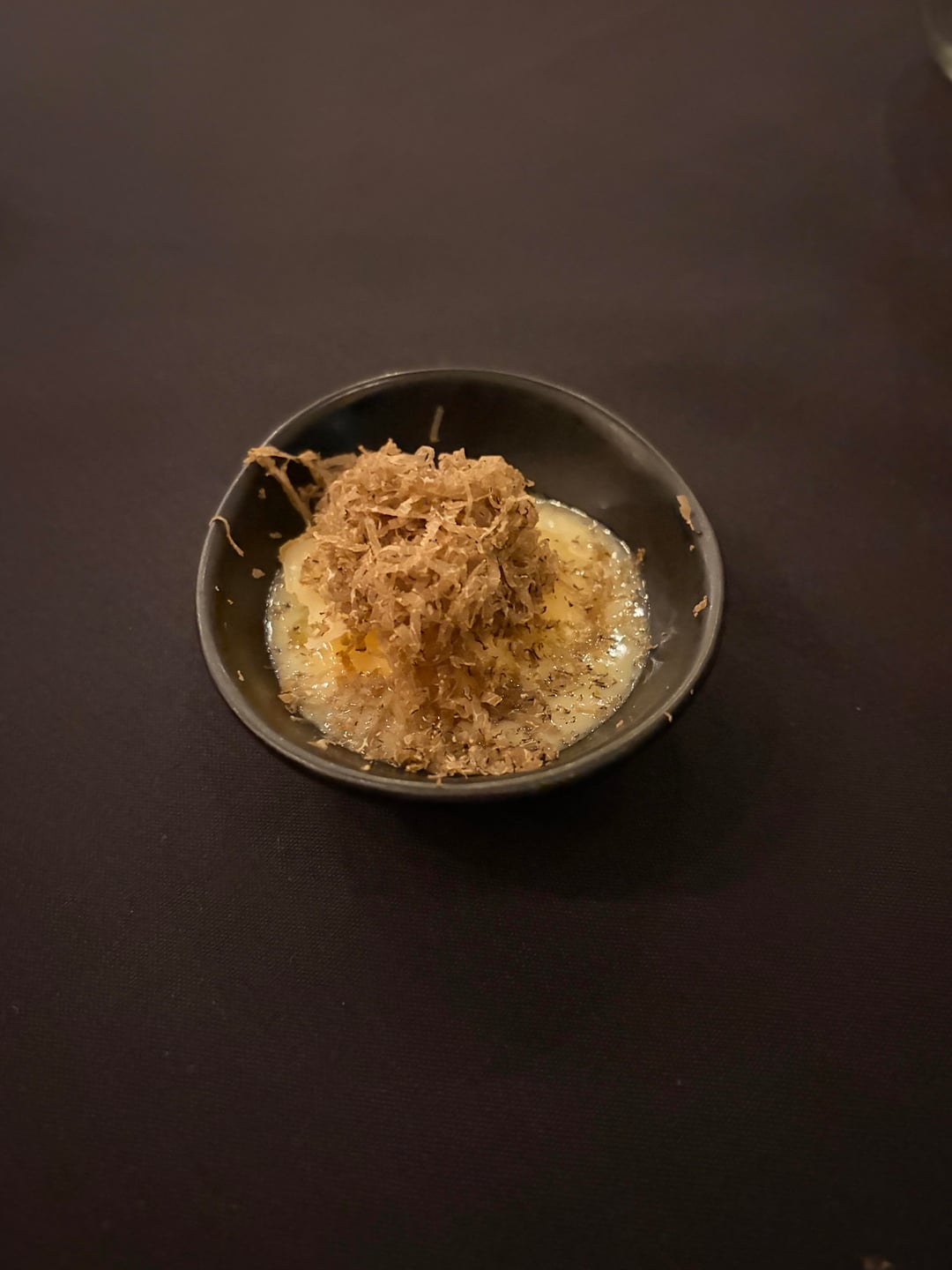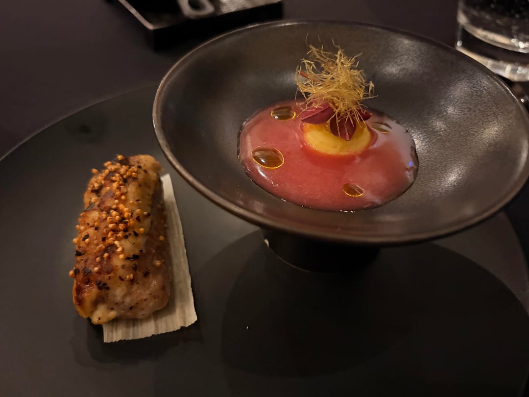 My favourite bites were definitely 1) ravioli shot which leans heavily on truffle 2) trout with lychee 3)rutabaga crepes with butter and caviar 4)cheese course with fenugreek, canale, and chocolate and mushrooms. Least favourite bites were 1) bubblegum taffy with plum soda 2) cornbread and 3) wagyu bc of inconsistent cook and some were definitely too cooked.