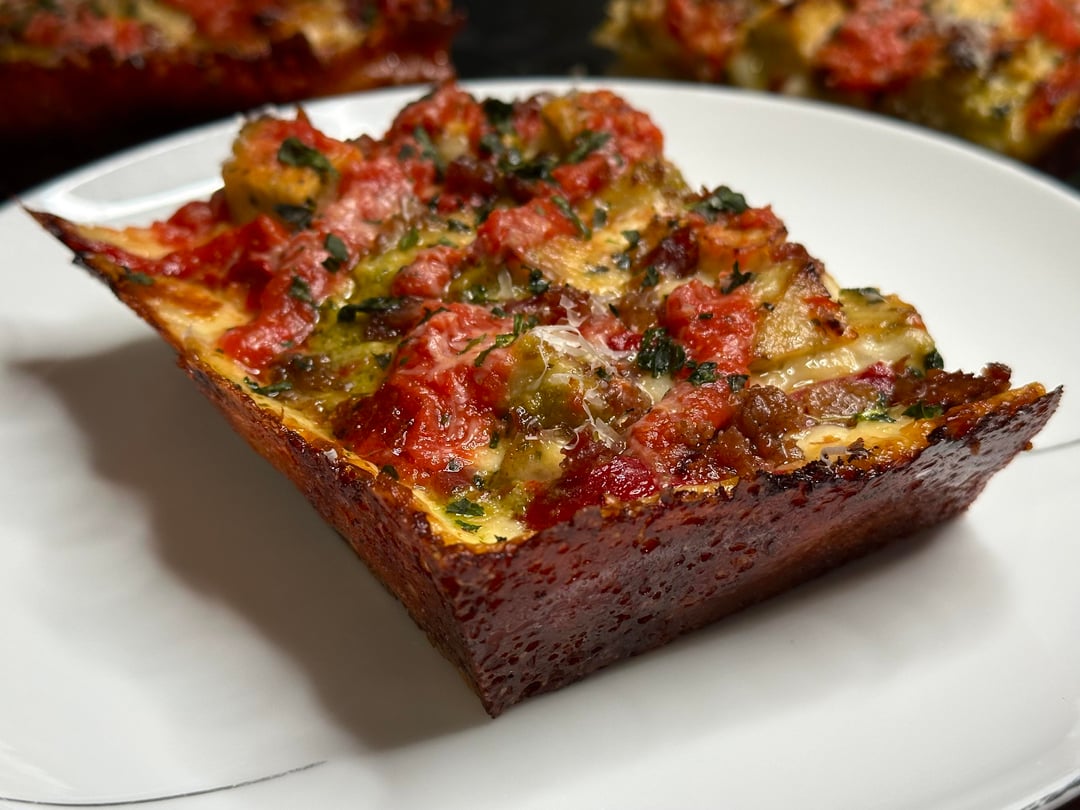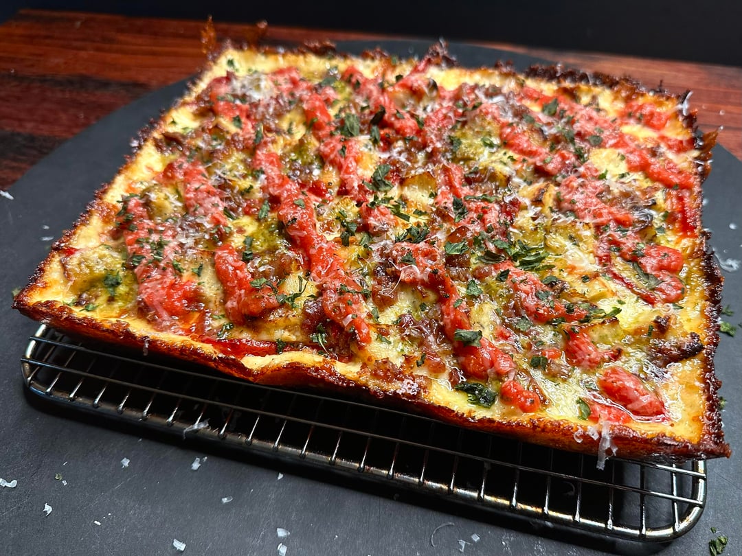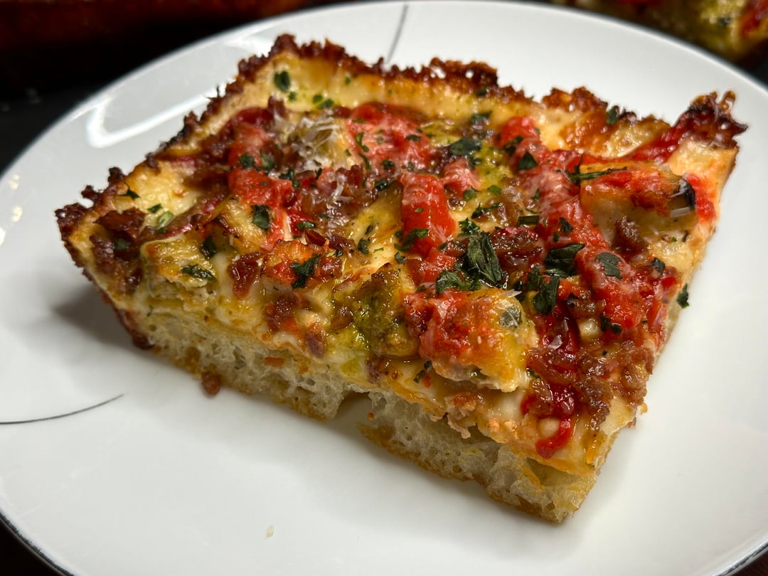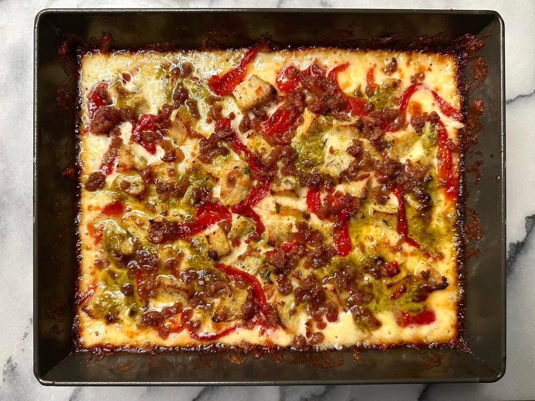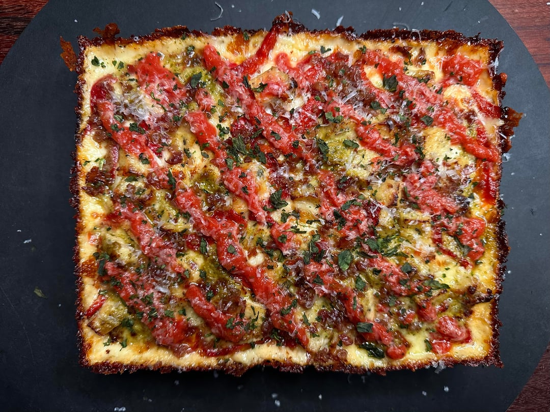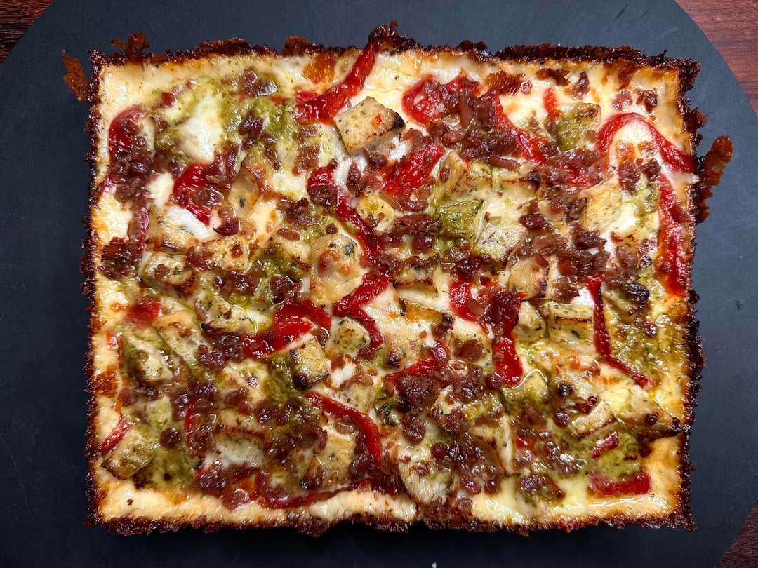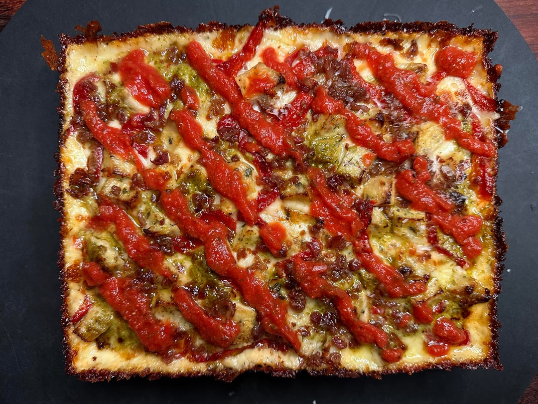 Pizza night! Something a little different tonight. I’ve only made a handful of Detroits, but I like them quite a bit. Since it was snowing tonight I decided to take a par baked Detroit crust, that I made a couple of months ago, out of the freezer and just bake it inside, which I’ve actually never done. The pizza was topped with cubed Muenster and Monterey Jack around the edges, and my regularly mix in the center, then I added some diced homemade chicken ricotta meatballs, roasted red peppers, bacon crumbles, and pesto. Out of the oven topped with tomato sauce, grated Parmigiano Reggiano, and some dried herbs.