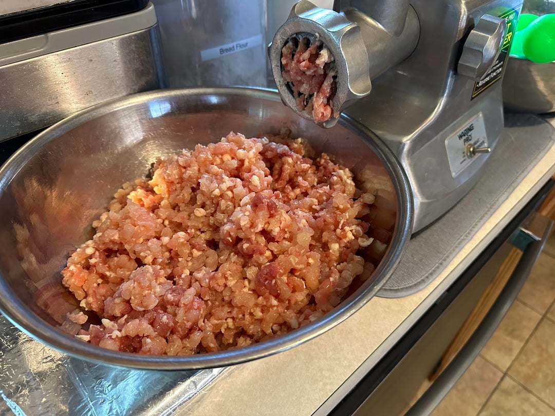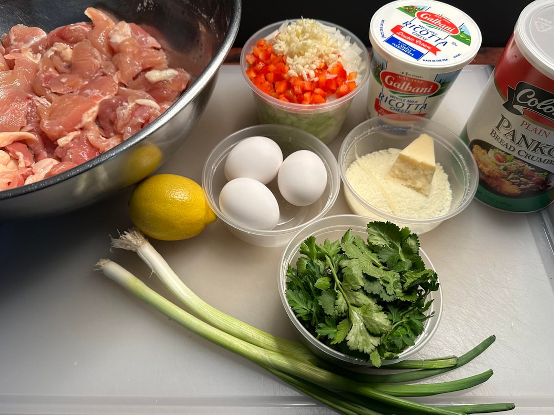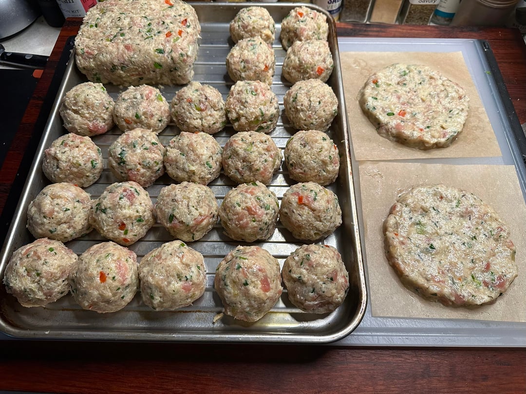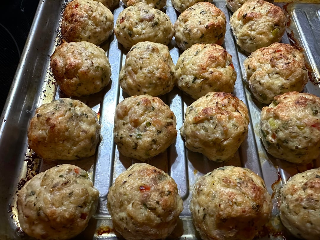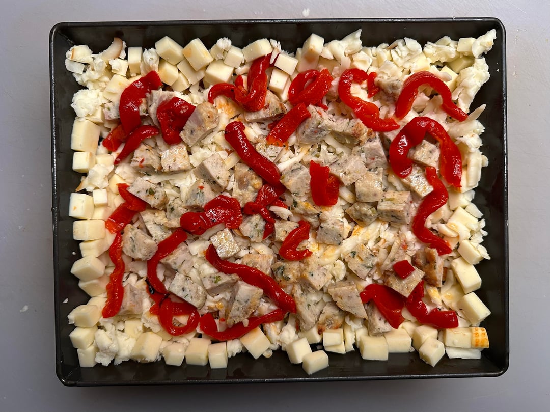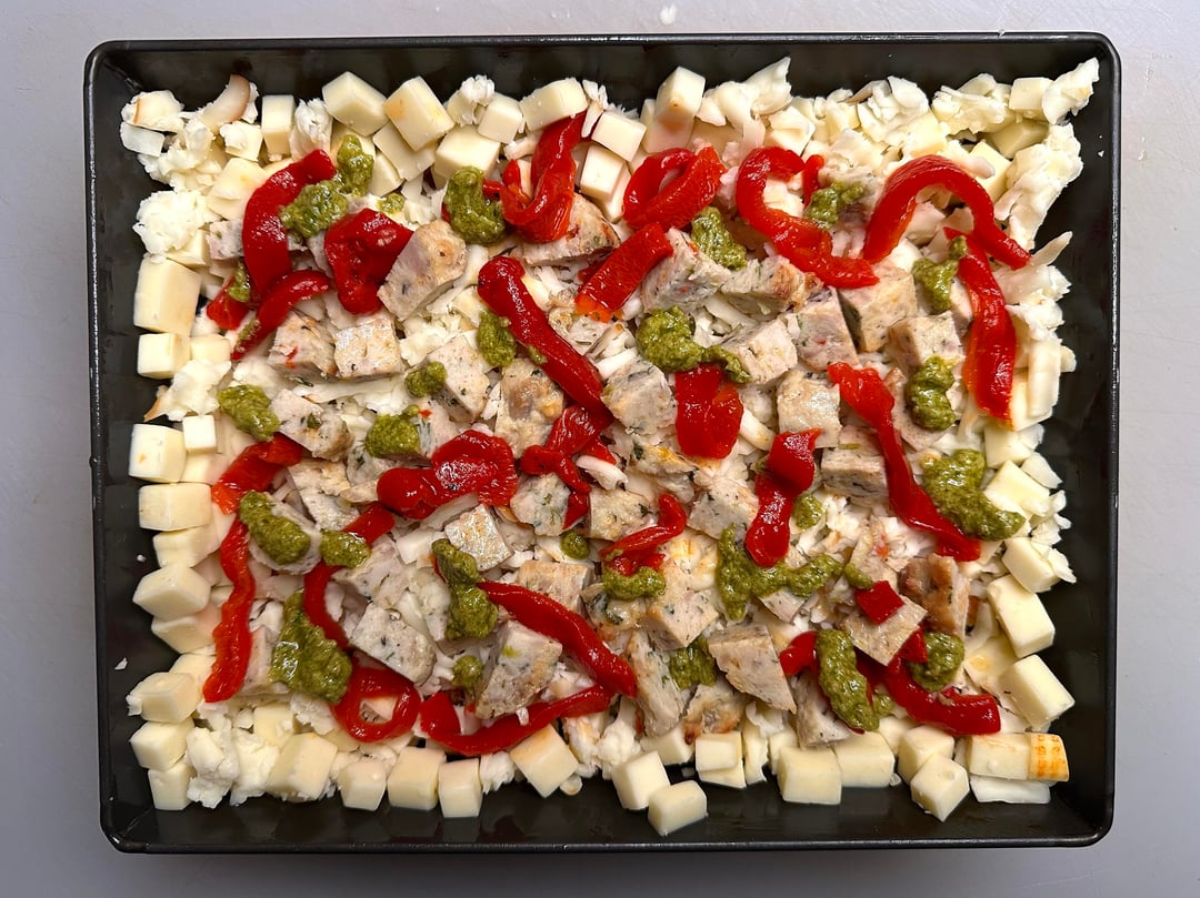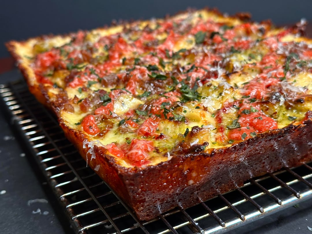 Pizza night! Something a little different tonight. I’ve only made a handful of Detroits, but I like them quite a bit. Since it was snowing tonight I decided to take a par baked Detroit crust, that I made a couple of months ago, out of the freezer and just bake it inside, which I’ve actually never done. The pizza was topped with cubed Muenster and Monterey Jack around the edges, and my regularly mix in the center, then I added some diced homemade chicken ricotta meatballs, roasted red peppers, bacon crumbles, and pesto. Out of the oven topped with tomato sauce, grated Parmigiano Reggiano, and some dried herbs.