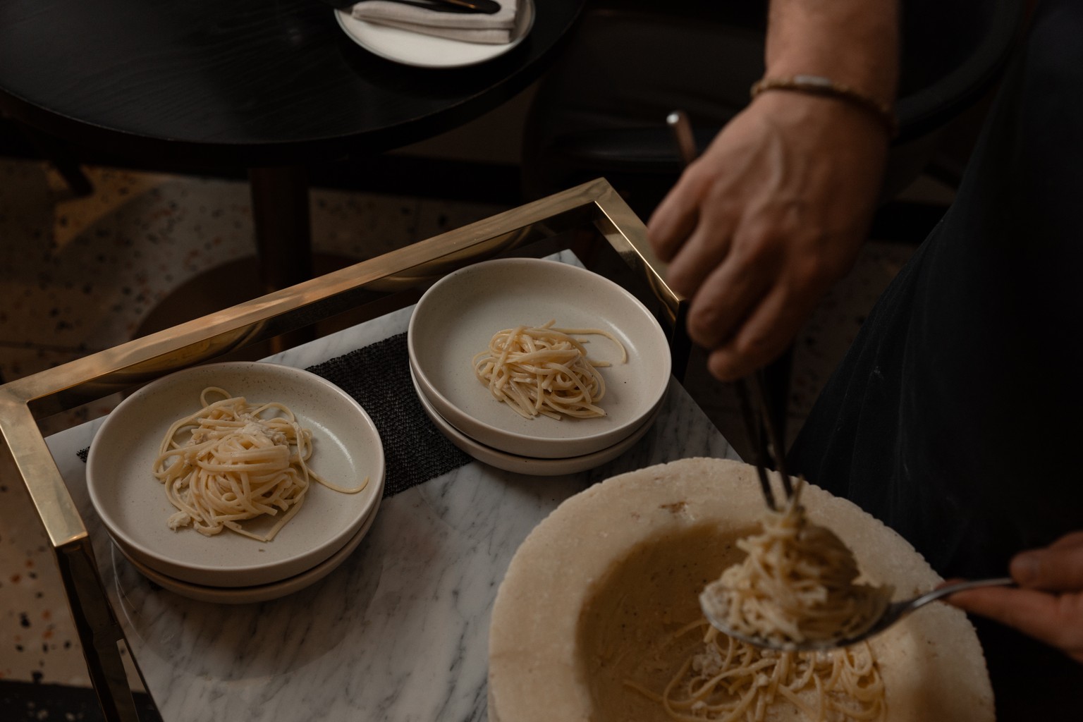 The cacio e pepe ritual features pasta finished in a cheese wheel. Image / Olivia Sattler