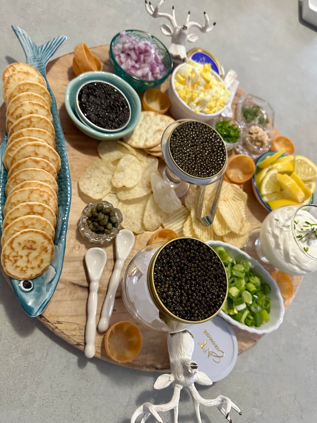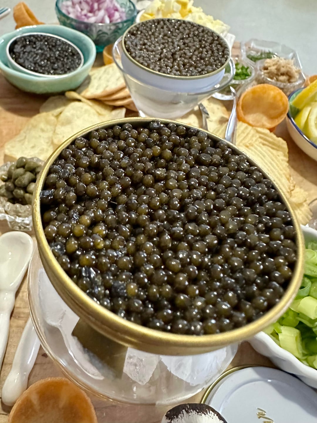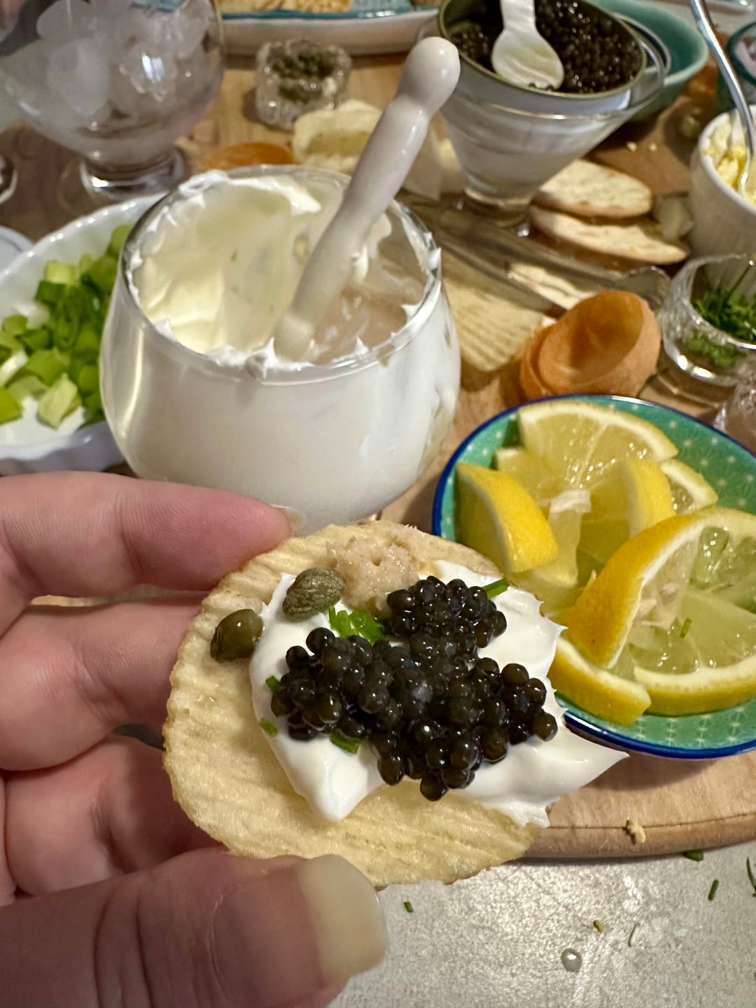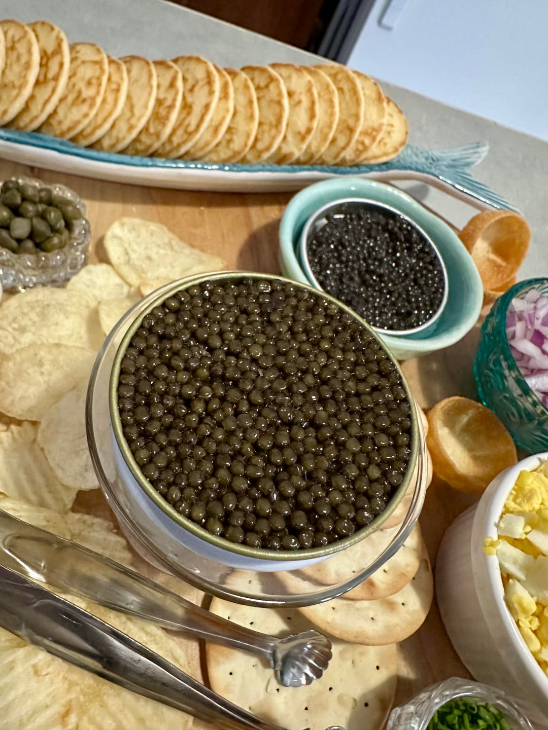My mom was gifted a bunch of tins of caviar from an anonymous friend, so she had me and my fiancé over for a caviar tasting party! This was my first time trying caviar and I really enjoyed it. I believe this might have been the most expensive meal I’ve ever eaten – I savored every bite!